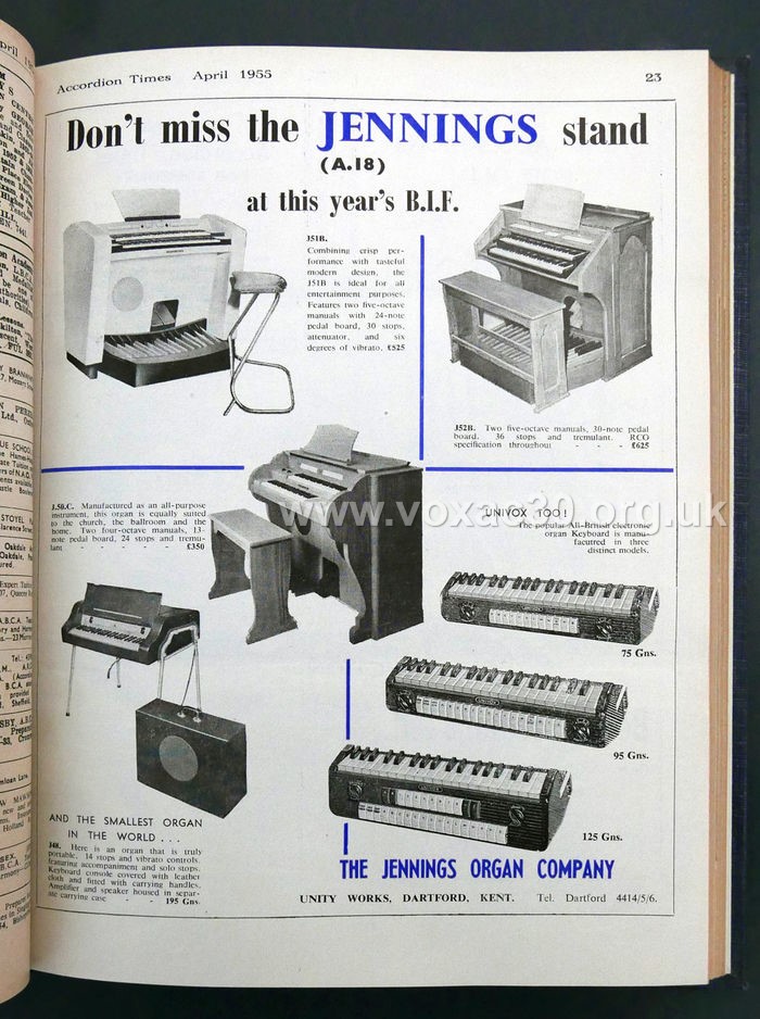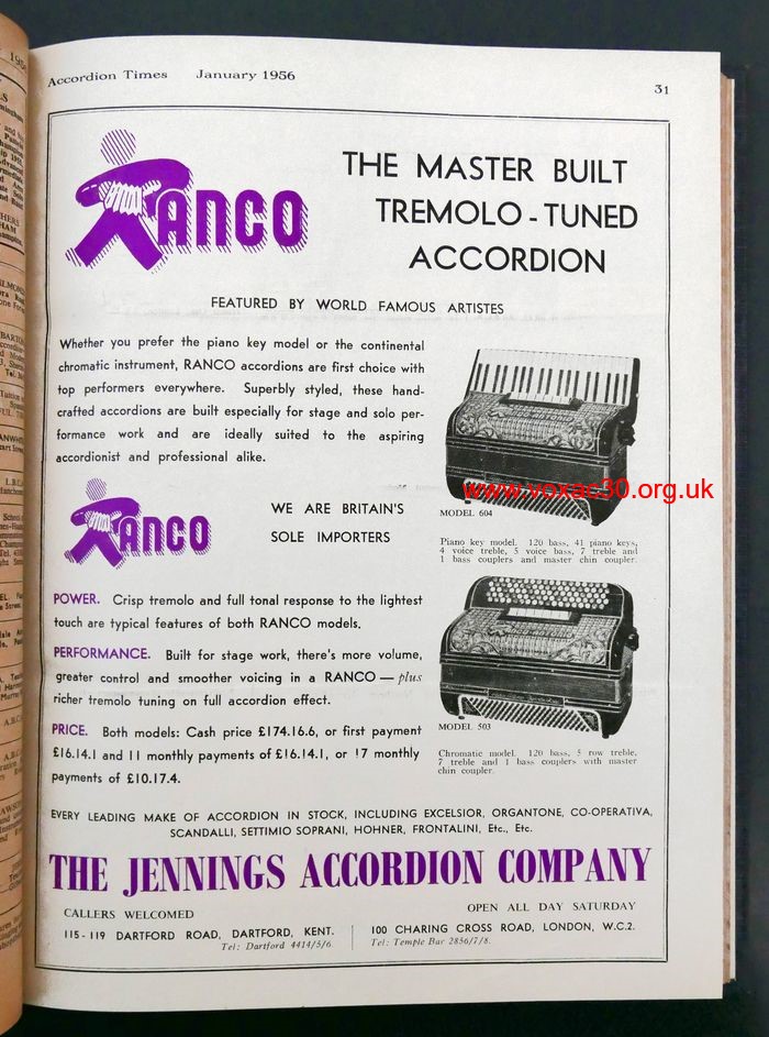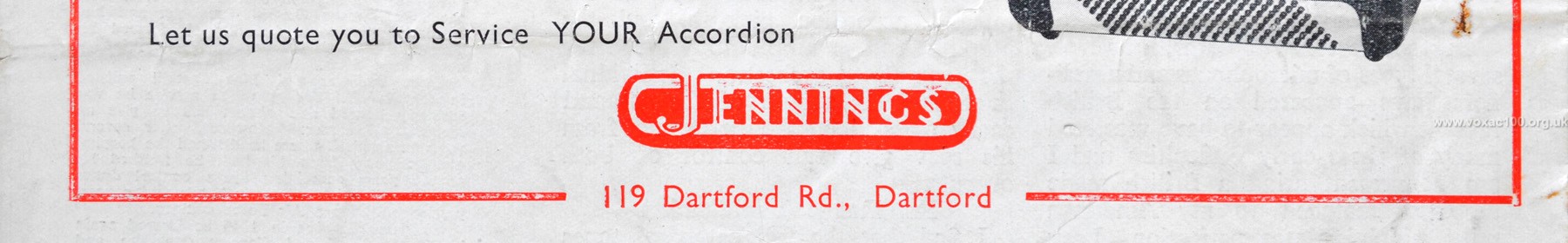 Early Jennings adverts for accordions, 1947-1955, invariably give the company's name either as "Jennings" alone, or as "Jennings Musical Instruments Limited". But following the announcement, in late 1955, that an "Accordion Centre" was to be created at 100 Charing Cross Road, "The Jennings Accordion Company" appears.