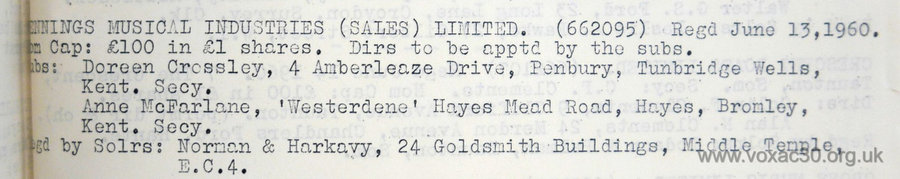 Not really a predecessor, but an adjunct. A few days after the trade fair at the Russell Hotel in late August 1964, Tom Jennings and Eric Summer, chairman of Royston Industries, the company that owned a controlling share in JMI, applied to Companies House to form "Vox Sound Equipment Limited". VSEL was duly incorporated on 11th September (entry below from the digest Companies House register).