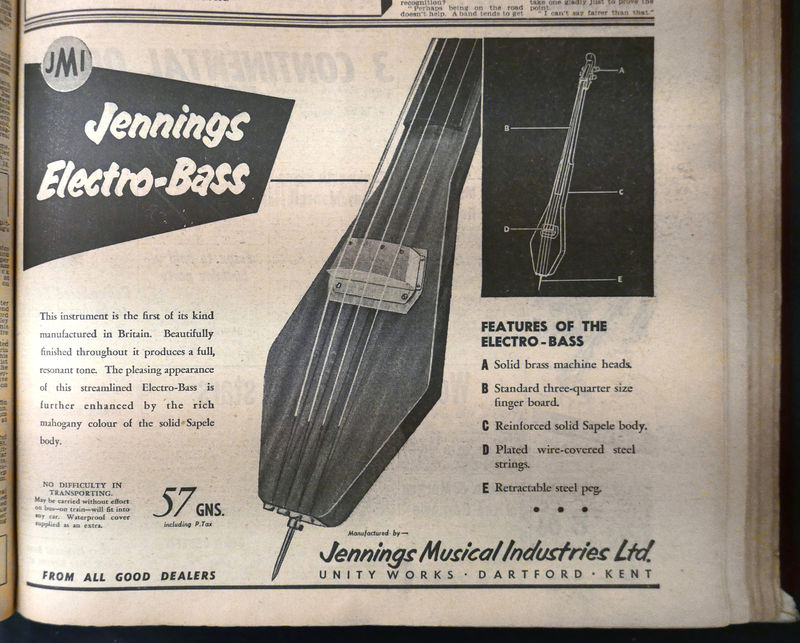 "Melody Maker" magazine, 1st September, 1956. The new Electro-Bass. "JMI" a simplified roundel, the dots between the letters dispensed with.