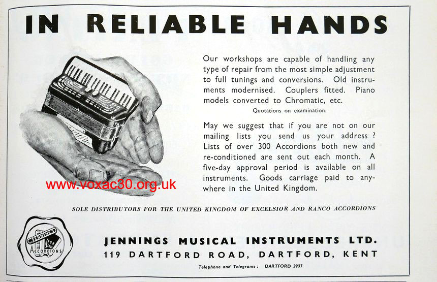 Accordions were Jennings's first line of business in early days. The shop at 100 Charing Cross Road, set up in 1950, did great trade - see this page for an overview. Notes on Alan Billington, the shop's first manager, can be found here.