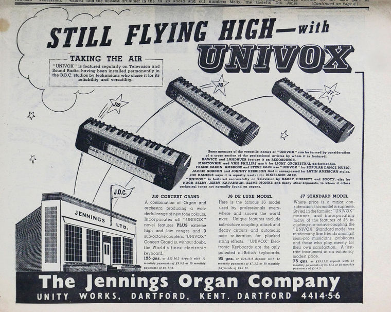 The Organ company seems to have been created at much the same time as the "Univox" keyboard - mid 1952. It is first mentioned explicitly in adverts in November 1952.