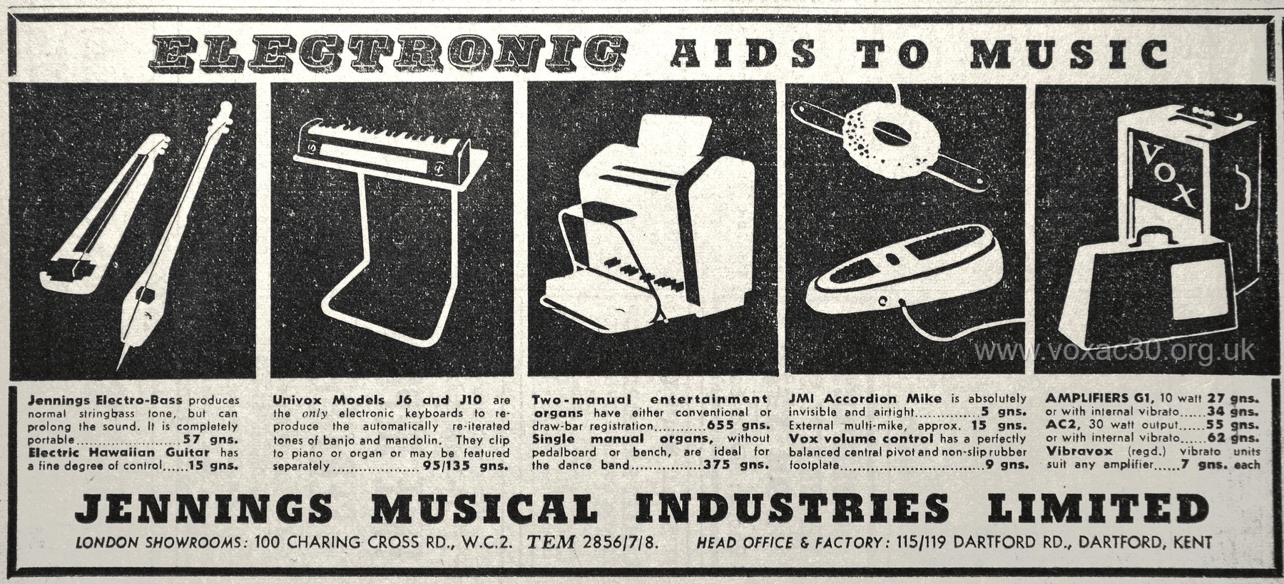 These questions aside, Jennings's commissions increased in number against stiff competition in the shape of Compton, which had effectively pioneered electronic church organs in the early 1950s, and Selmer, which had begun its own advertising campaigns in "Musical Opinion" and "The Organ", putting considerable effort behind its promotion of "The Minster" organ. Towards the end of the year, and doubtless in response to a changing sales environment, Jennings revised its prices - the range now pitched at between 375 and 1700 guineas. The 375 guinea unit will have been the "Model DS", a single manual pictured at that price in later brochures and advertisements.