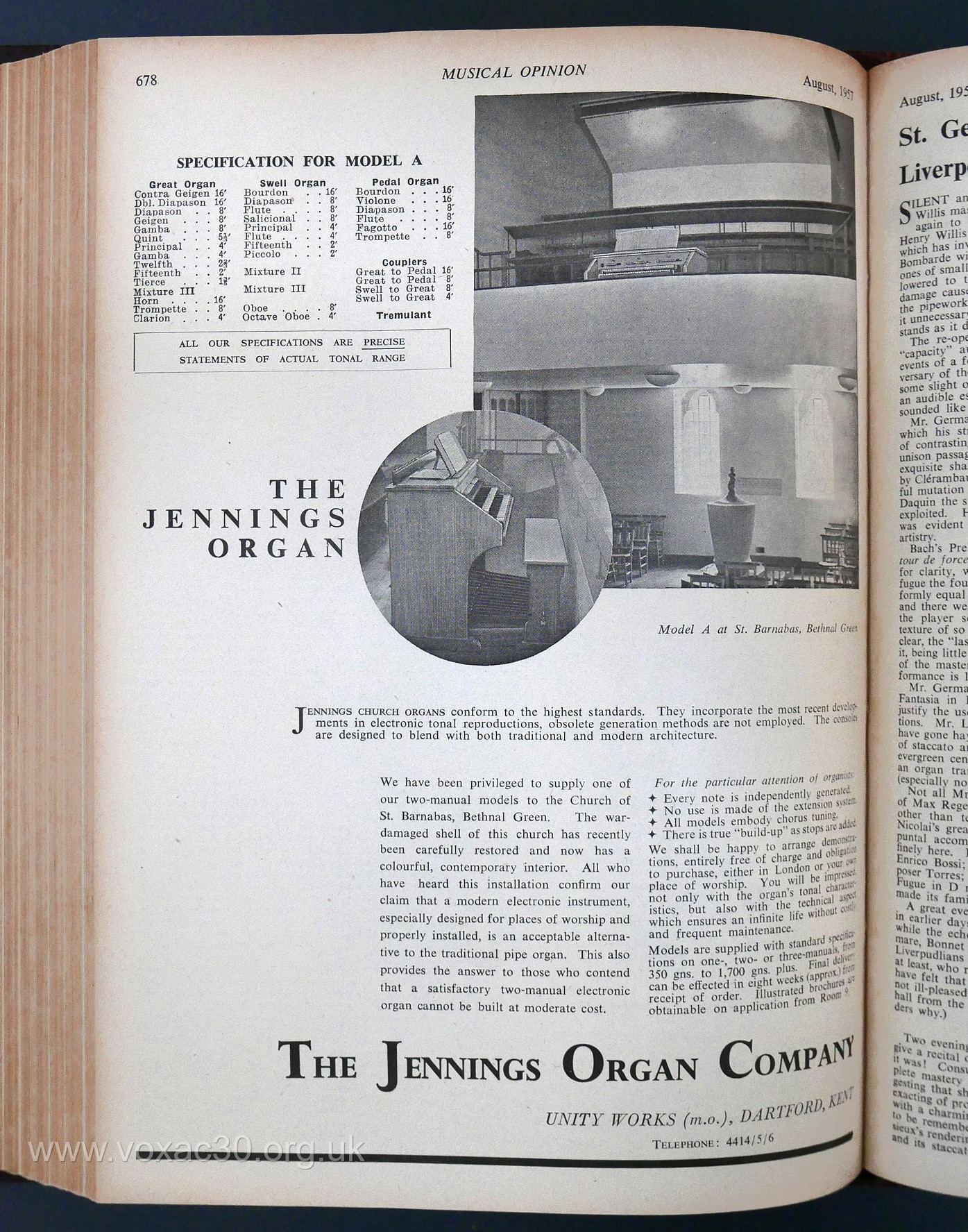 "Musical Opinion" magazine, August, 1957: installation at St Barnabas, Bethnal Green.
