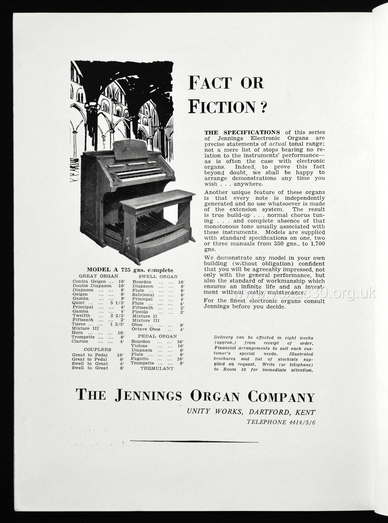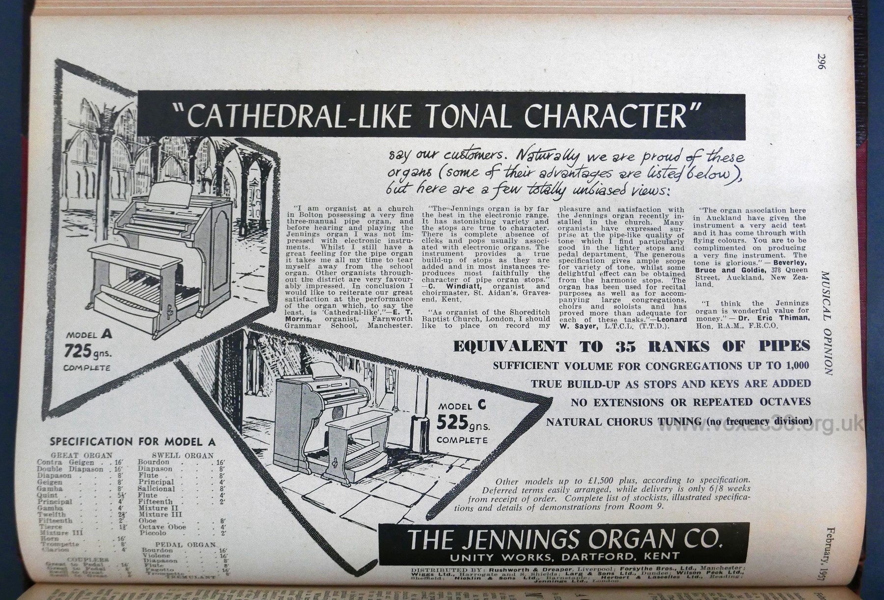 Two models were promoted initially - the "Model A" and "Model C", both two-manual console organs, and both descendants of the original J52 "Church Organ". The first series of ads regularly had endorsements from satisfied users, including one from Cyril Windiate (sometimes given as Windiatt), organist and choirmaster of St Aidan's, Gravesend, and later Tom Jennings's assistant.