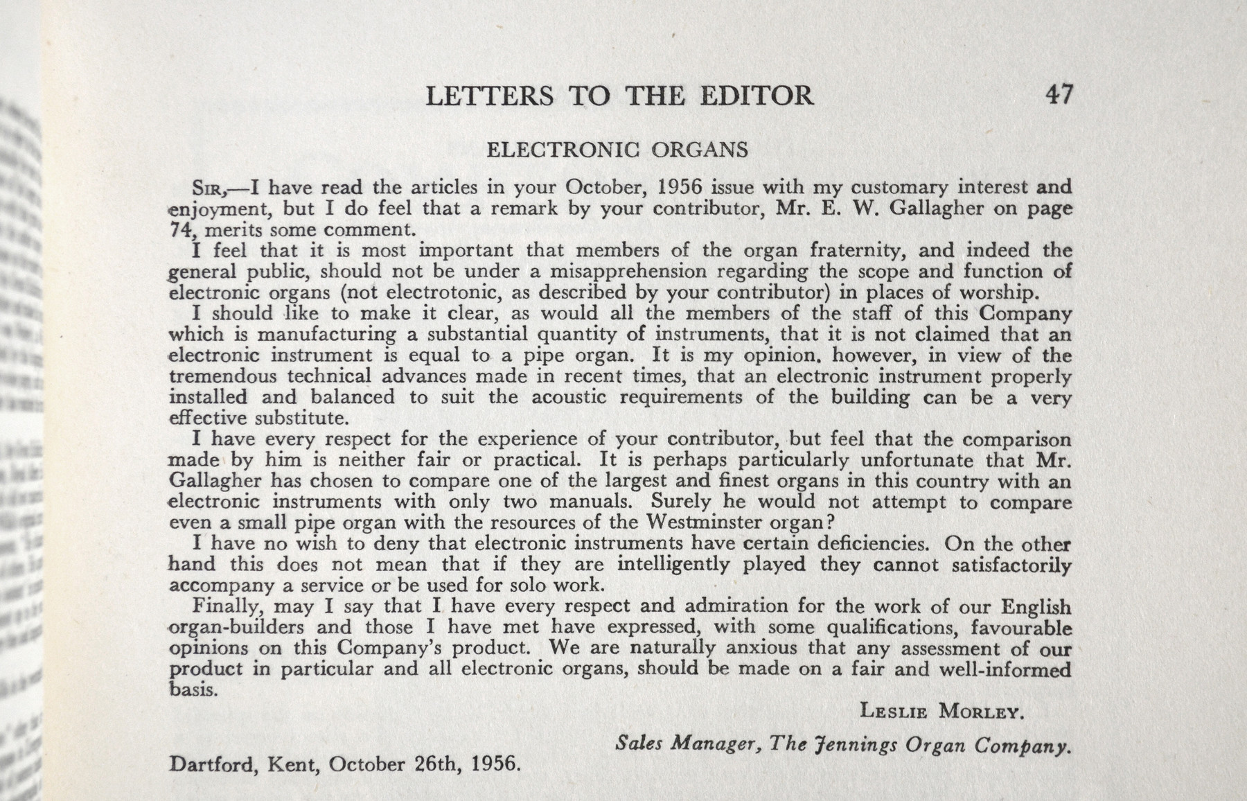 But there were niggles. Doubts had been expressed in an article in "The Organ" about the wisdom of electronic organ installations in churches. Leslie Morley of Jennings rose to the challenge in October: