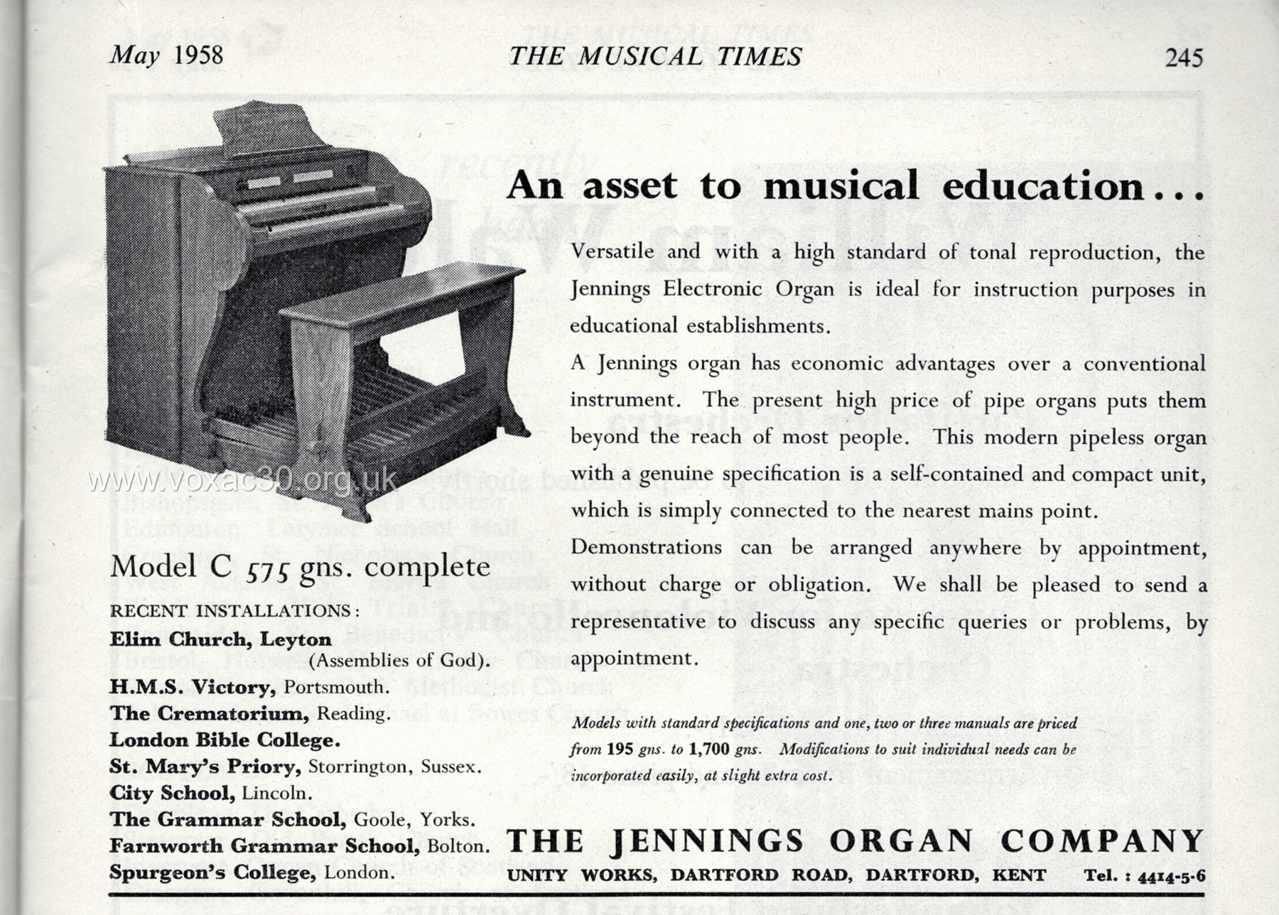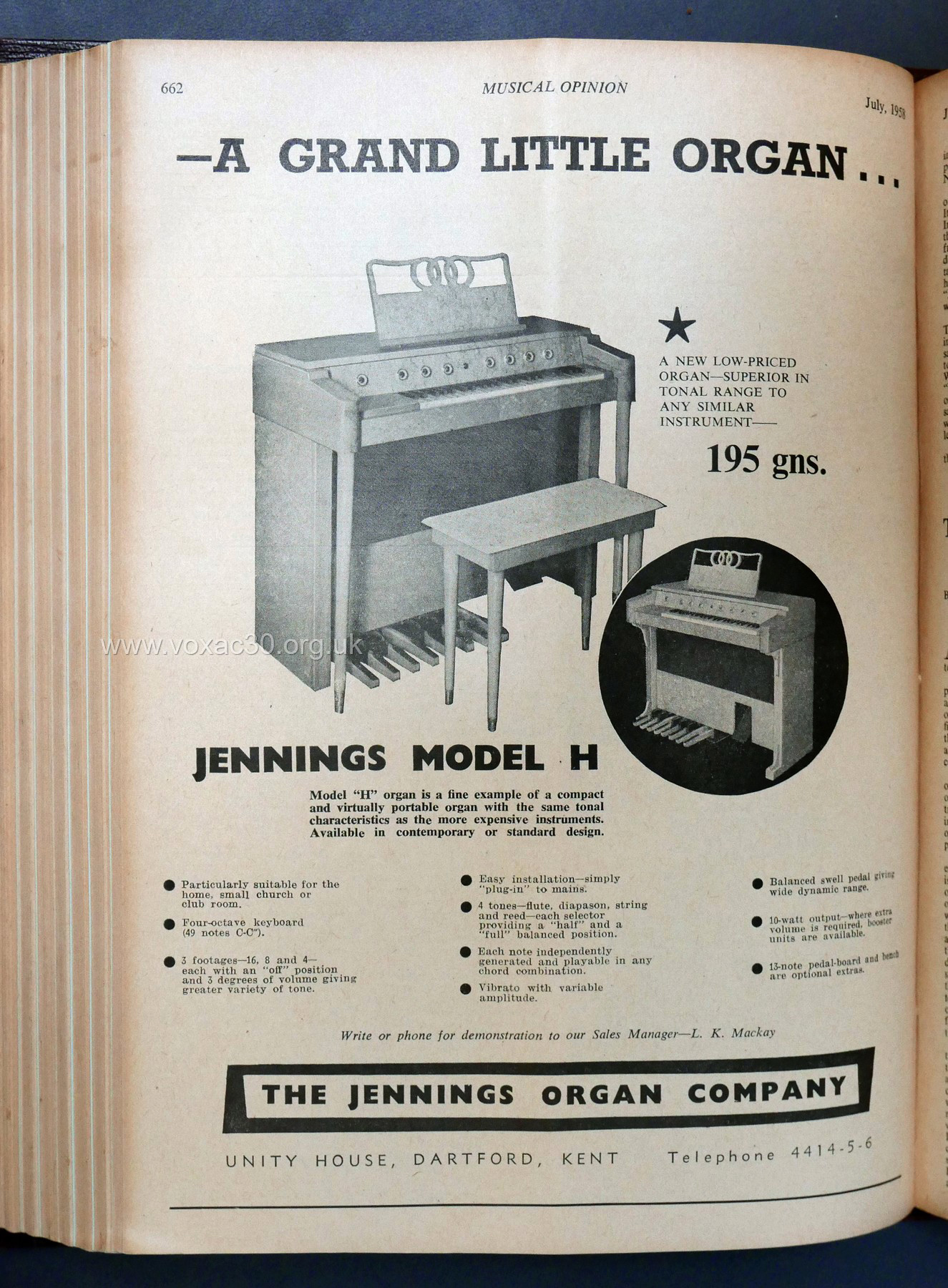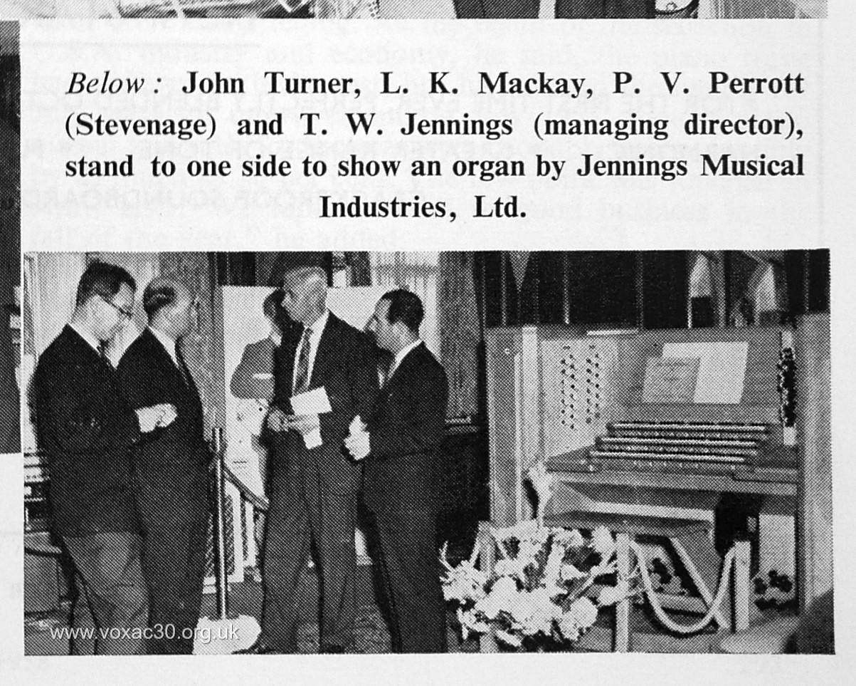 Music Trade press, August 1958, part of a review of the Jennings display at the AMII Music Trade Fair, Cafe Royal - the Model D organ.