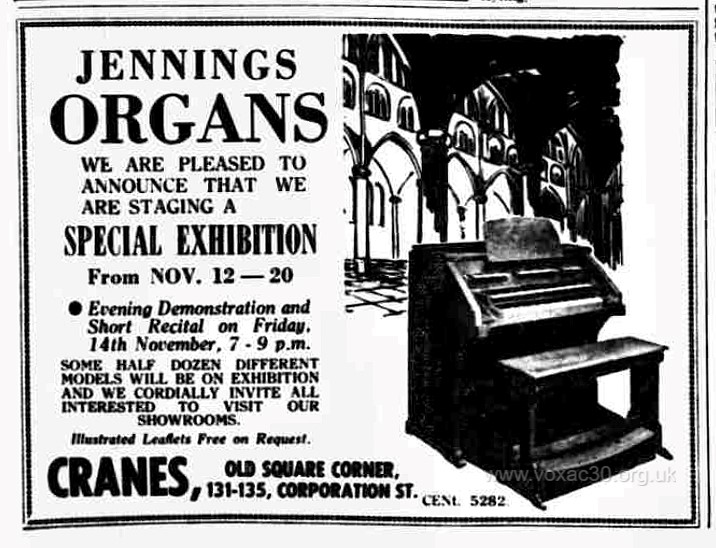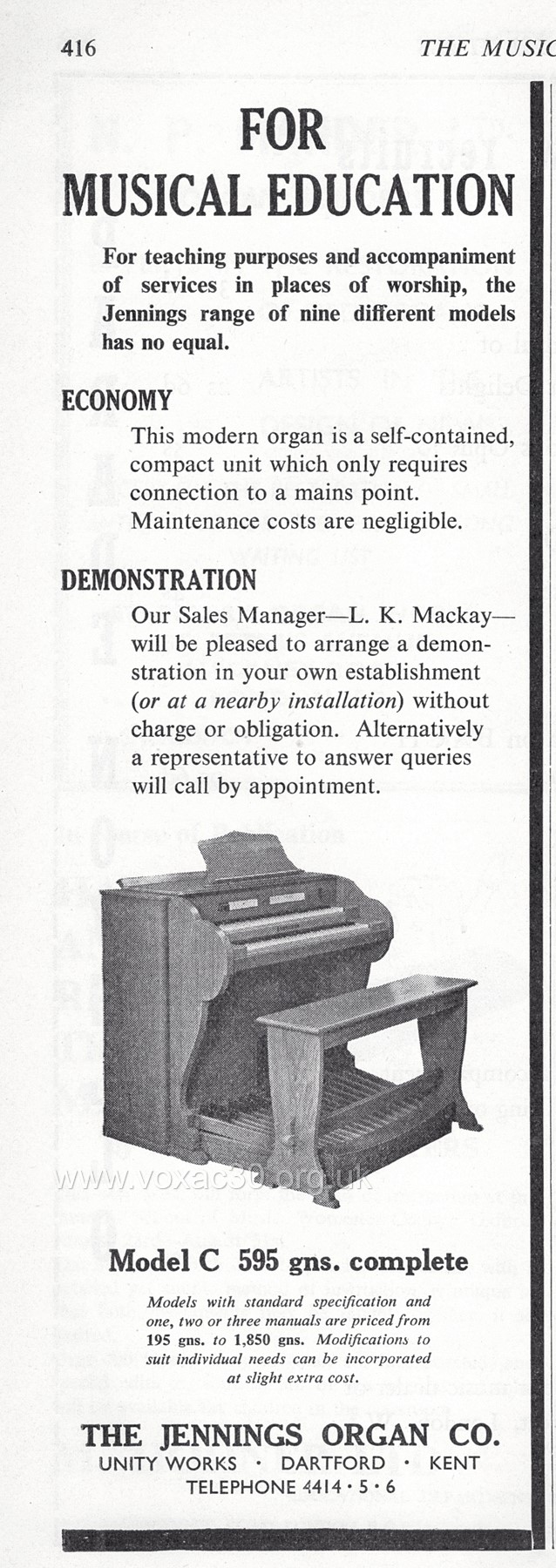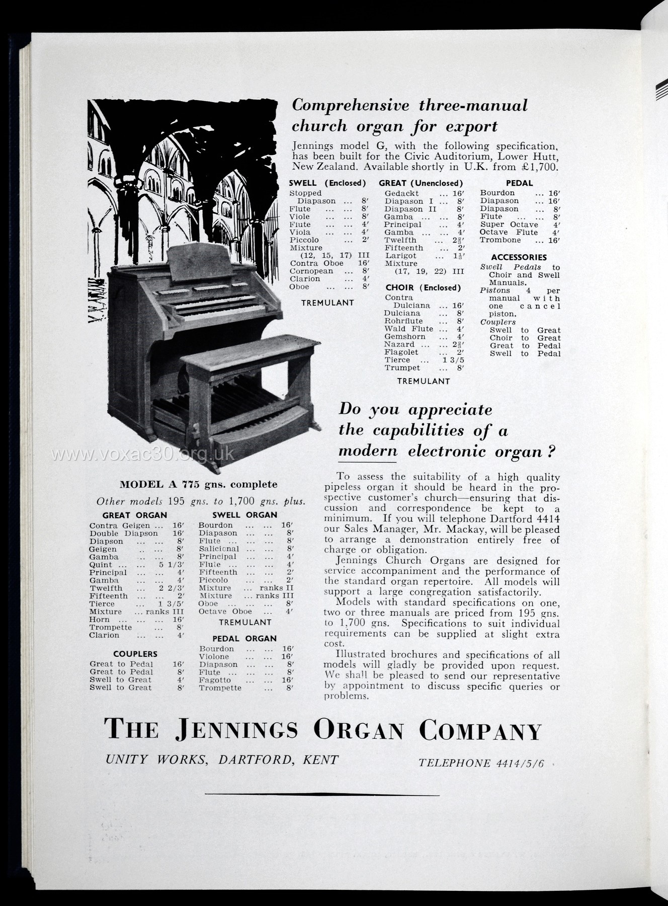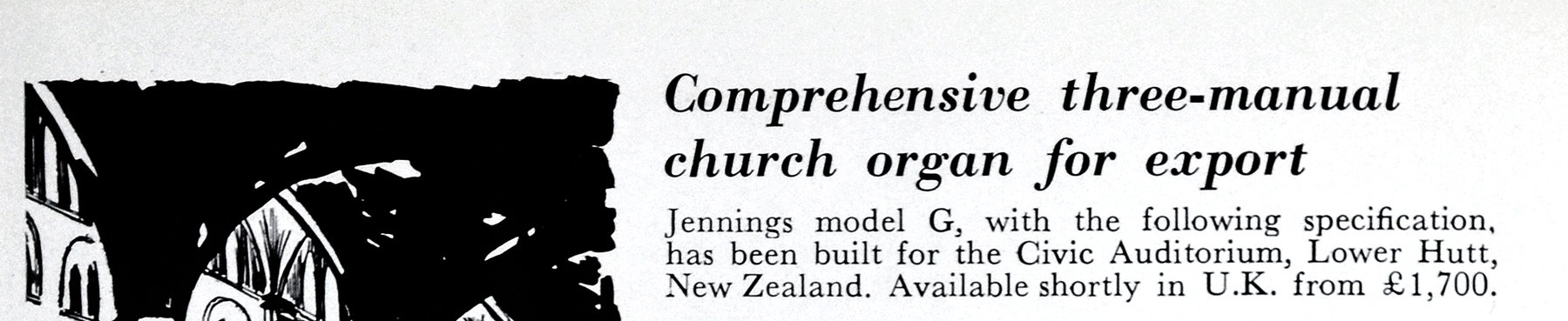 The new complex also had the distinction of being fitted with a Jennings "Model G" three-manual organ, probably the first example of a revised version (the question of "versions" to be taken up later). Note the line in the advert below: "Available Shortly in the UK":