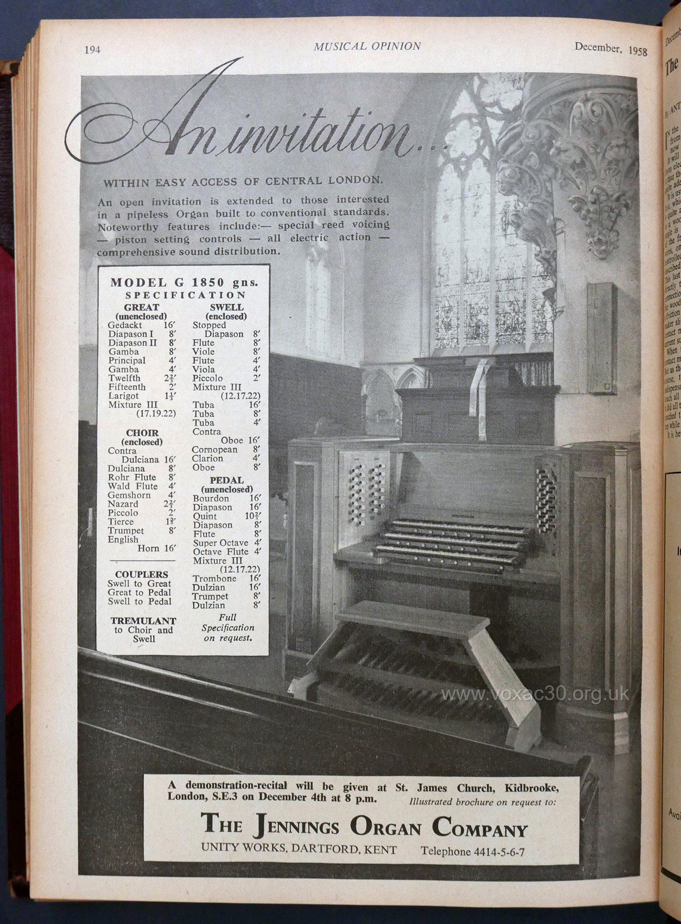 "Musical Opinion" magazine, December 1958. An almost identical ad was run in November, but signalling the that date of the demonstration was to be confirmed. The installation in St James, Kidbrooke, was photographed by Derek Underdown.