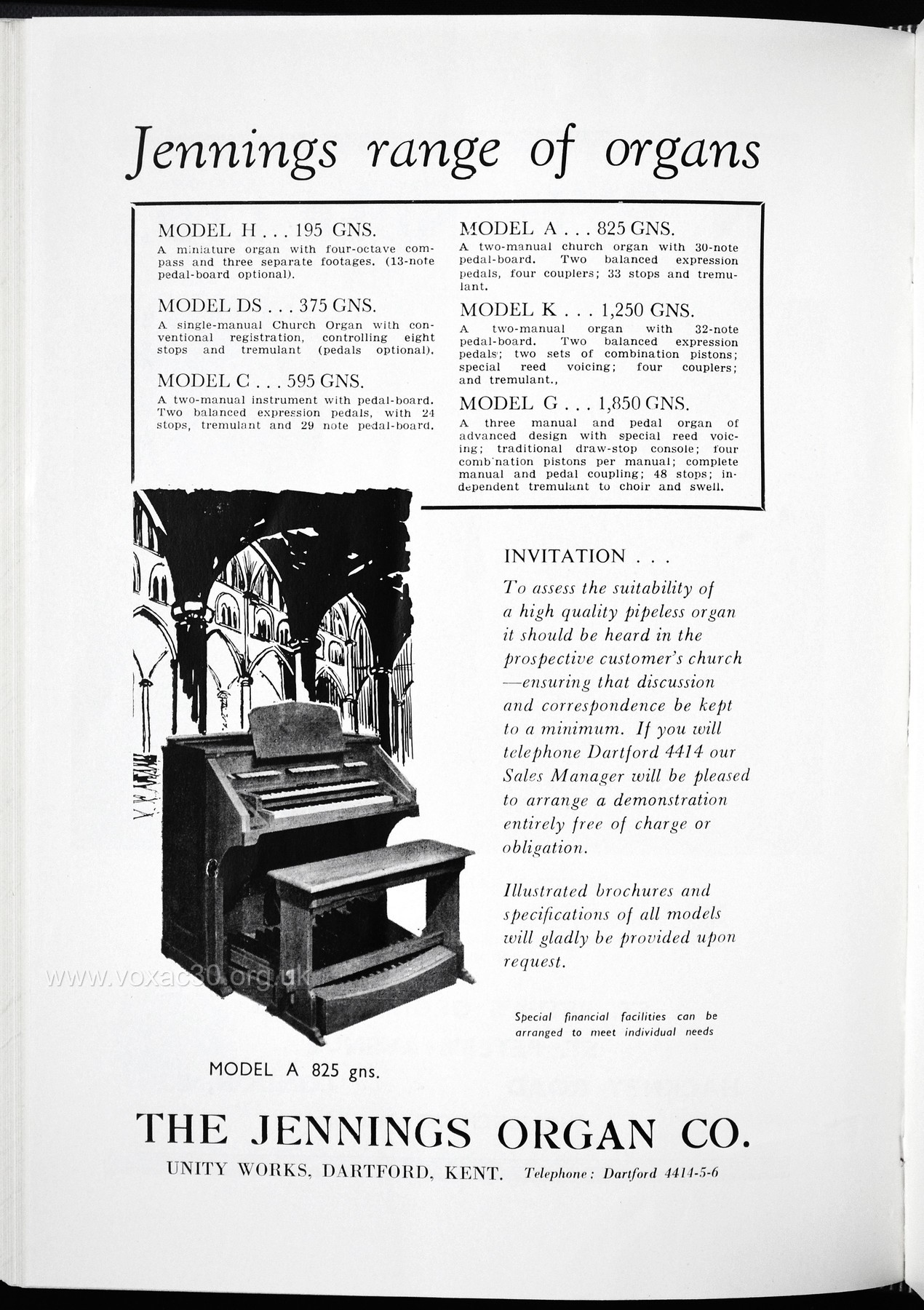 At Dartford Road work naturally continued on the expansion of the range, the result of which was the "Model H", which came out early in the year (February), and the "Model K", in October. Specifications were listed in adverts and brochures. Although the two-manual "Model E" is mentioned for the first time in August, there is a strong chance that it had actually ben released earlier. Of the two-manual organs in the range, only the "Model A" was normally promoted individually.