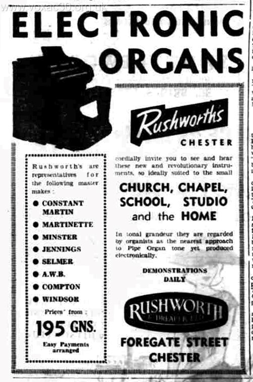 Other overseas installations were noted in an advert published in "Musical Opinion" in mid 1959. More on those to come. It is worth noting that these institutions are in the main ecclesiastical ones. The company's "secular" organs - the Model B, D1, D2 and D-350 - sold well too. See the advert placed in the "New Musical Express", 30th October, below. A digest of the various models can be found on this page.