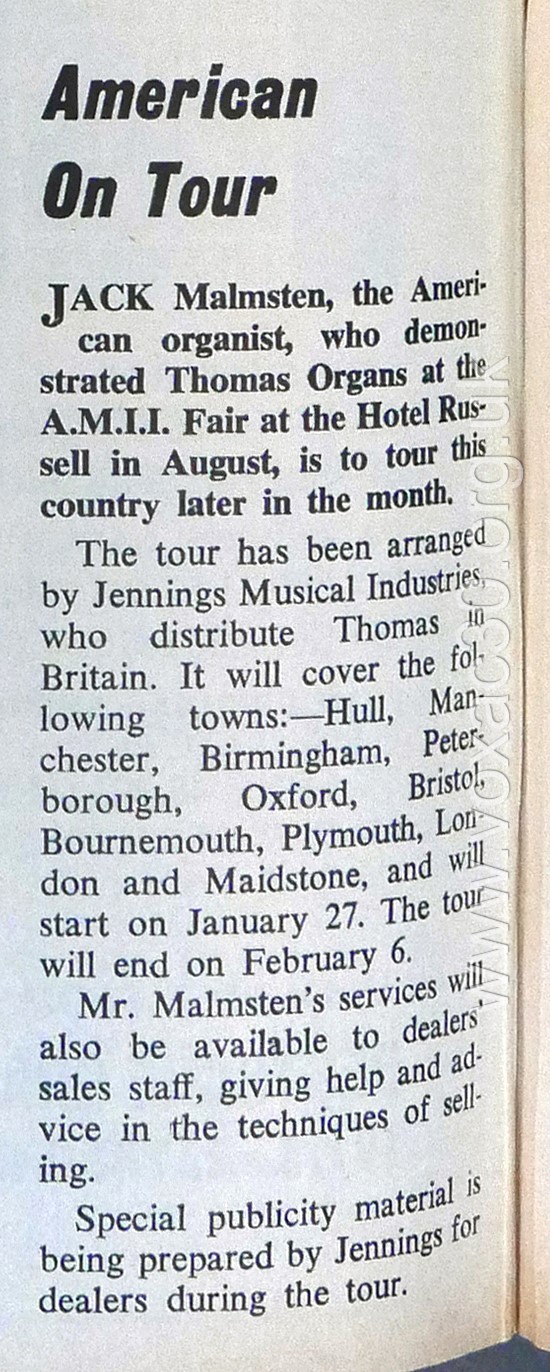 Strong links were first forged between the Thomas Organ Company and Jennings in the late summer of 1963 when Jennings took on the distribution of Thomas organs in the UK. The arrangement was announced at the Russell Hotel Trade Fair in August, and separately in the music industry press in September.
