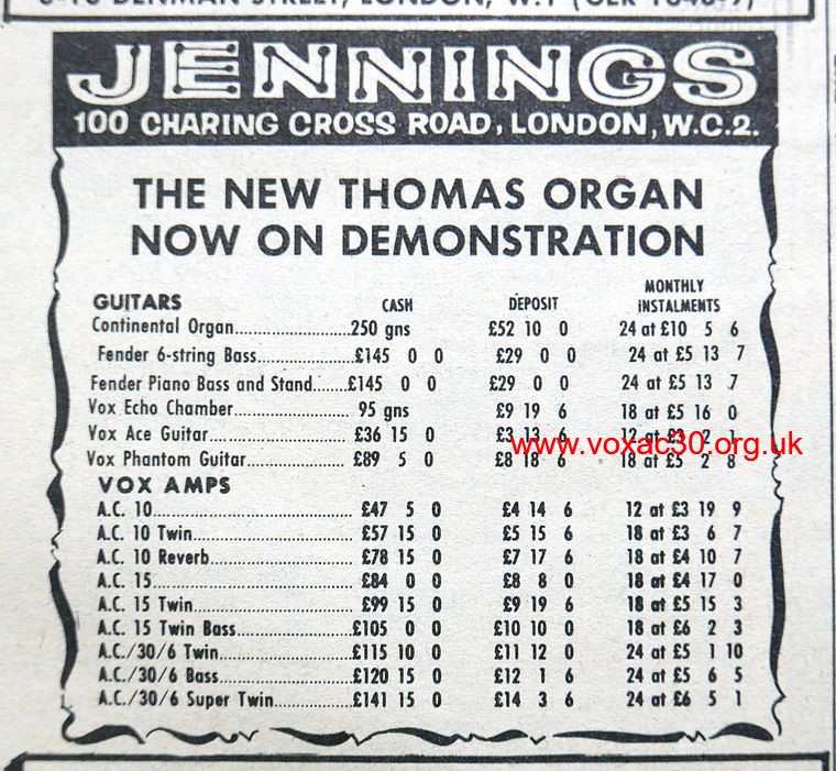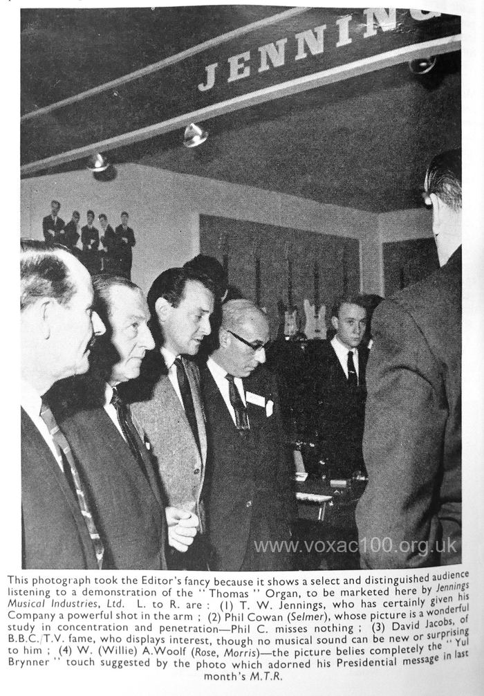 Two things flowed from the arrangement: - Jennings further scaled down its own production of console organs; and in the late summer of 1964, Thomas agreed to distribute Jennings equipment (Vox) in the USA - the "Million Dollar Deal". To anyone who knew that Jennings distributed Thomas equipment, this cannot have been too much of a surprise.