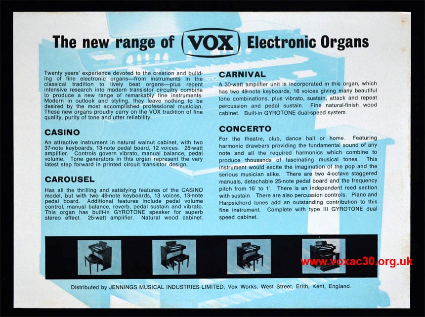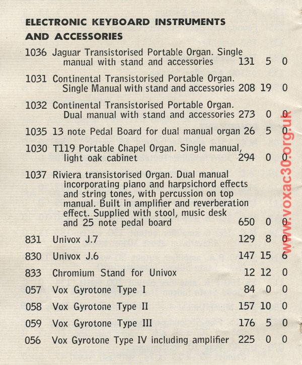 The pricelist above indicates how things stood four months before the British Musical Instrument Industries Trade Fair of August 1967 (the key event of the year for most manufacturers in Britain). The Riviera had just been released along with the Gyrotone rotary speaker cabinets, and the Jaguar was still relatively new, but the other items listed were in varying degrees relatively old - the Univoxes indeed stretching back to 1953.