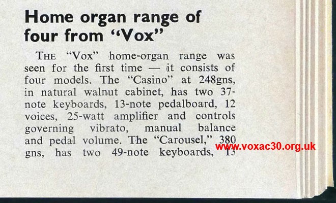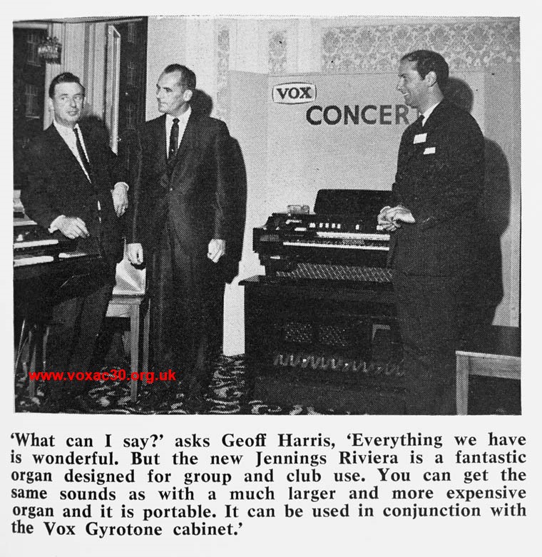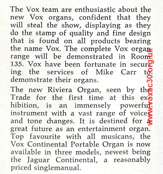 Mike Carr, an accomplished keyboardist (on the London jazz scene), was drafted in to demonstrate the new (and old) units. A general page on the Fair is available on the Vox AC100 website.