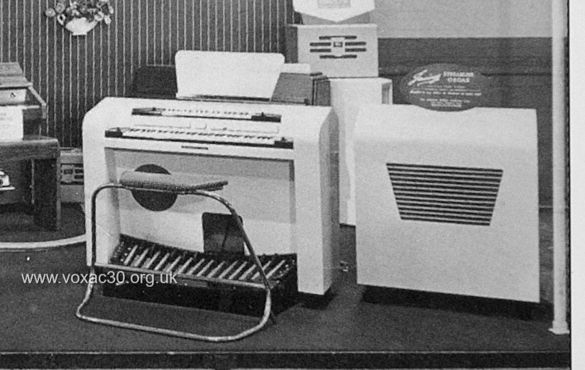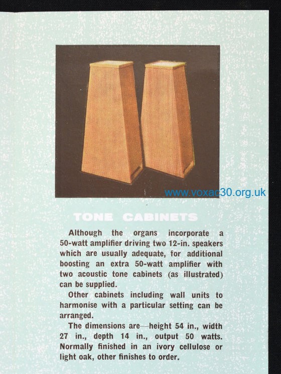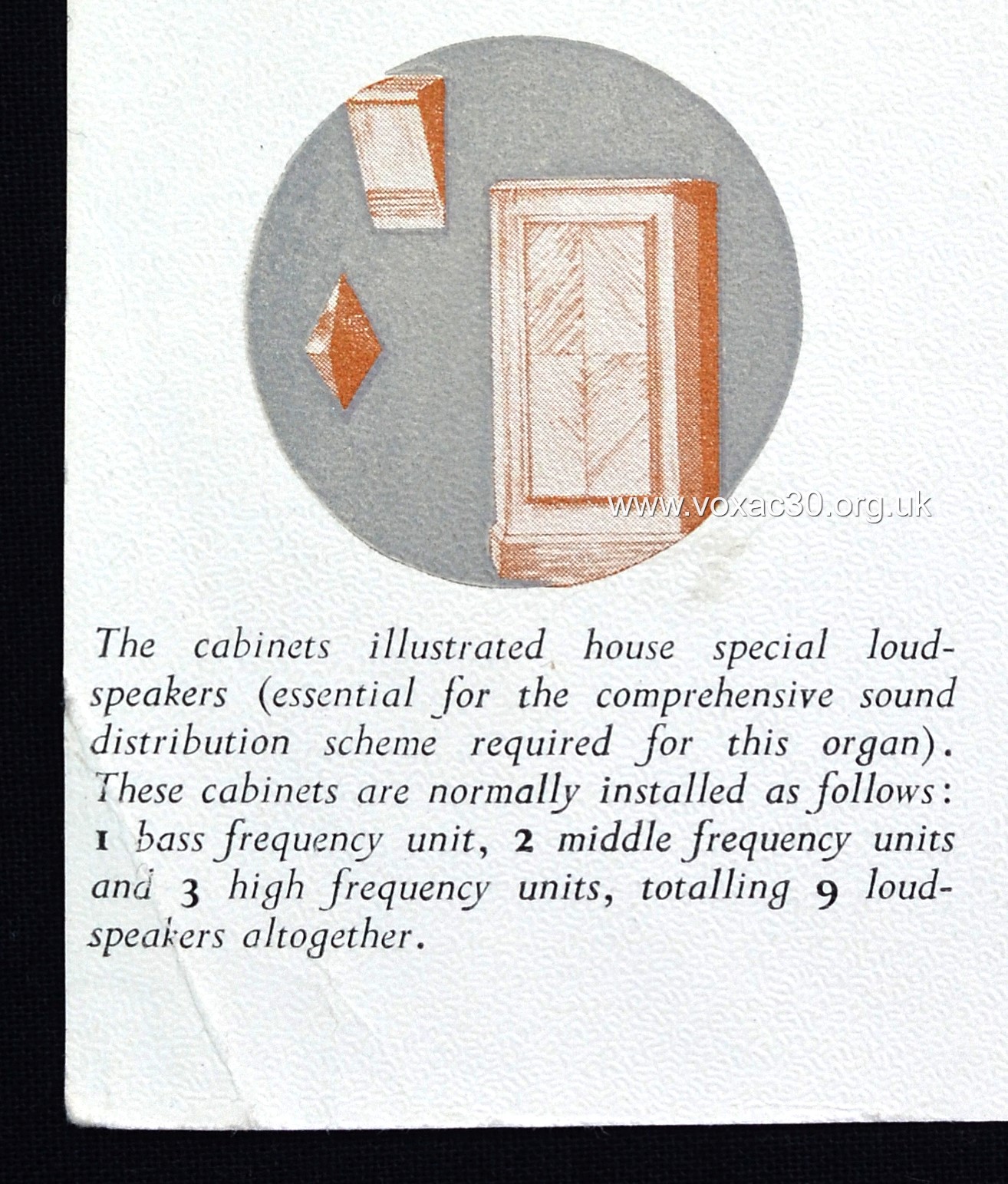 Below, a detail from a flyer for the Model G organ, late 1960 / early 1961. Nine speakers were recommended, as its three power sections could put out a total 150 watts. The bass enclosure probably contained a Goodmans Audiom 90, an 18" driver developed in the early 1950s for organ and public address applications. The middle frequency wall-mounted units possibly something like the Goodmans Audiom 60; the wall-mounted tweeters perhaps embodying a pair each of Goodmans Trebax horns?