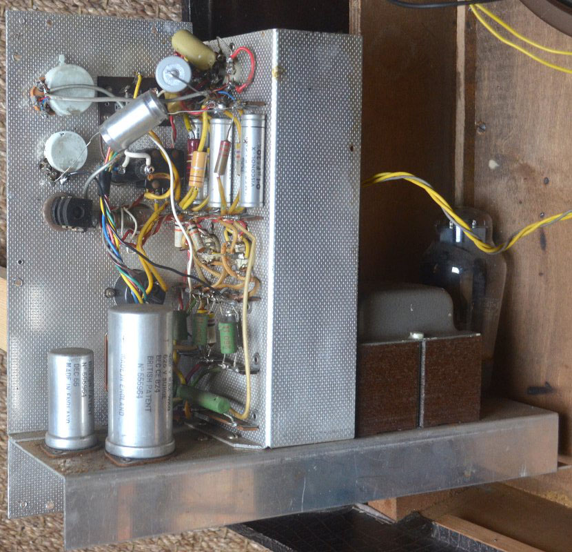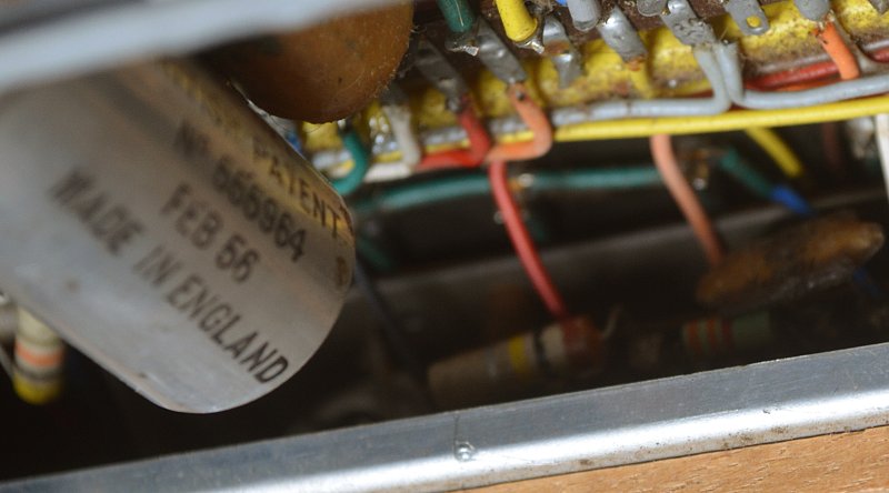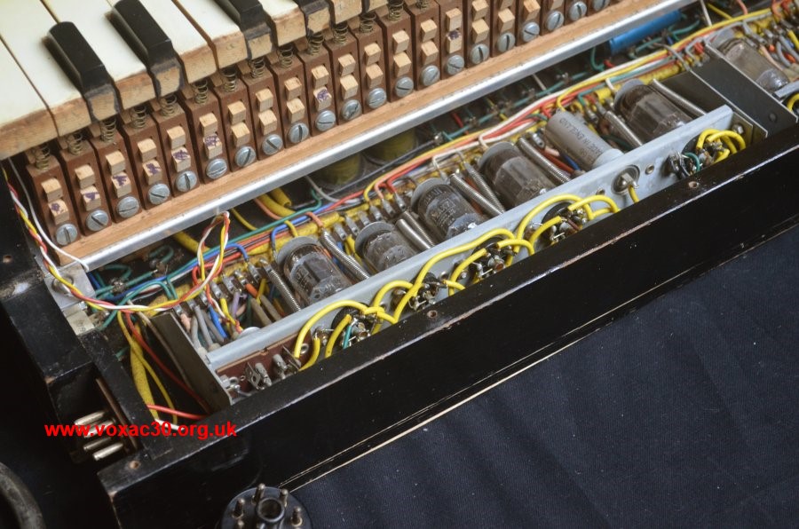 The principal electrolytic capacitors are dated December 1955 (in the power section) and February 1956 (in the keyboard). The Mullard valves have "B6B" date codes = February 1956 for their manufacture. Details can be seen in the pictures further down this page.