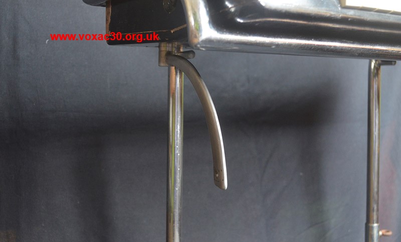 A detail of the keyboard on its adjustable chrome stand, the curved volume / swell control bar in position. The bar operates a potentiometer inside the keyboard case.