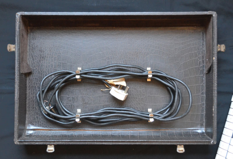 The inside of the lid with spring clips for the cables. The mains cable (pictured), longer than one normally finds later on, has a standard Bulgin plug for the amplifier section.