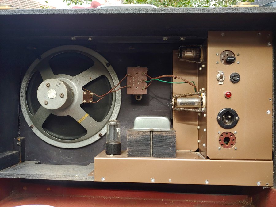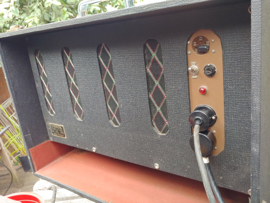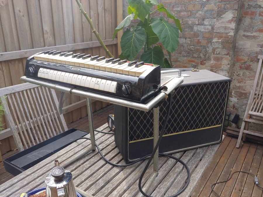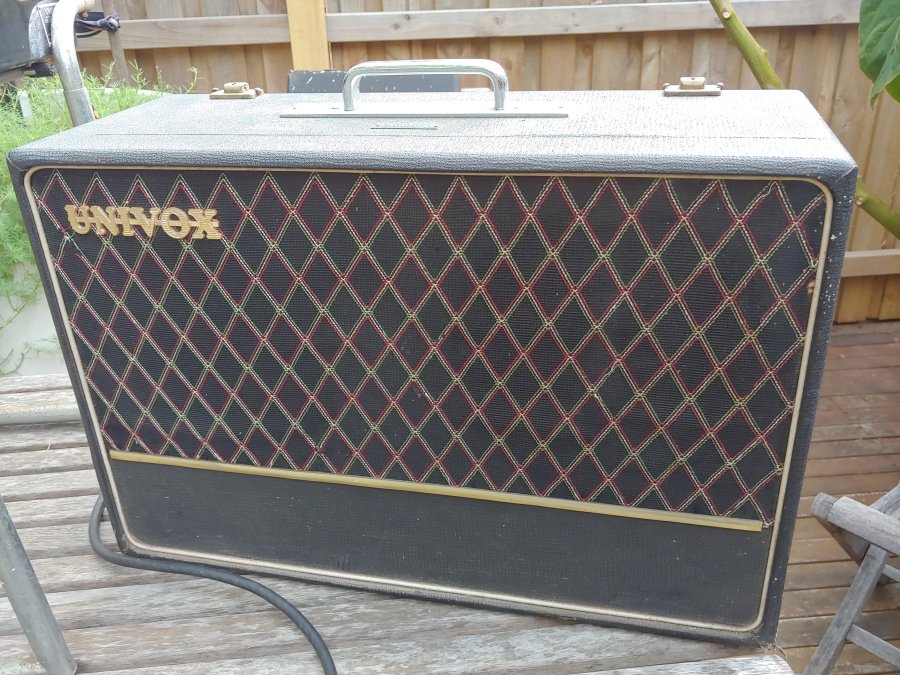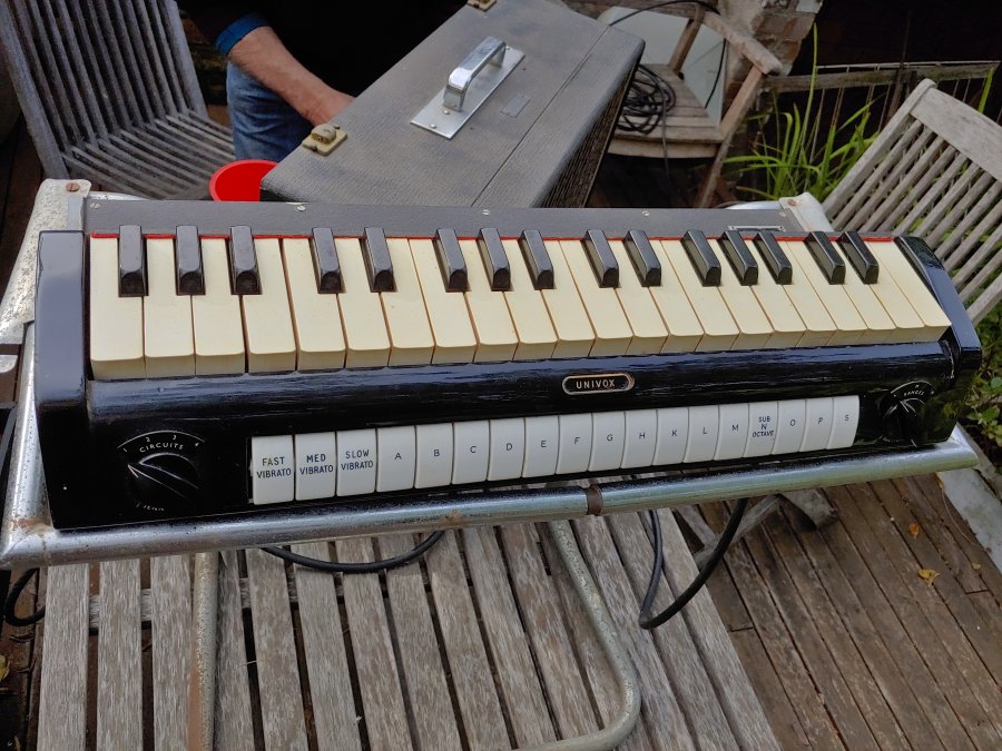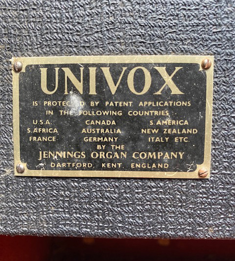 A superb late Univox J6. Black grille cloth, basketweave vinyl, silver Elac 10N/86 speaker. The patent plaque seems to be have been given a sort of anodised brass finish. Most are plain aluminium. In the upper half of the lid, a compartment for storing the mains and keyboard cables. The chrome gigster stand divides into two sections for ease of carrying/storage.