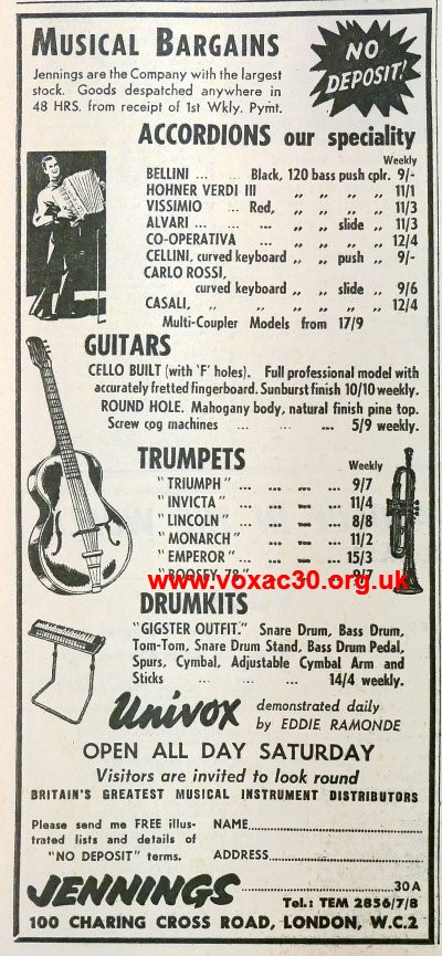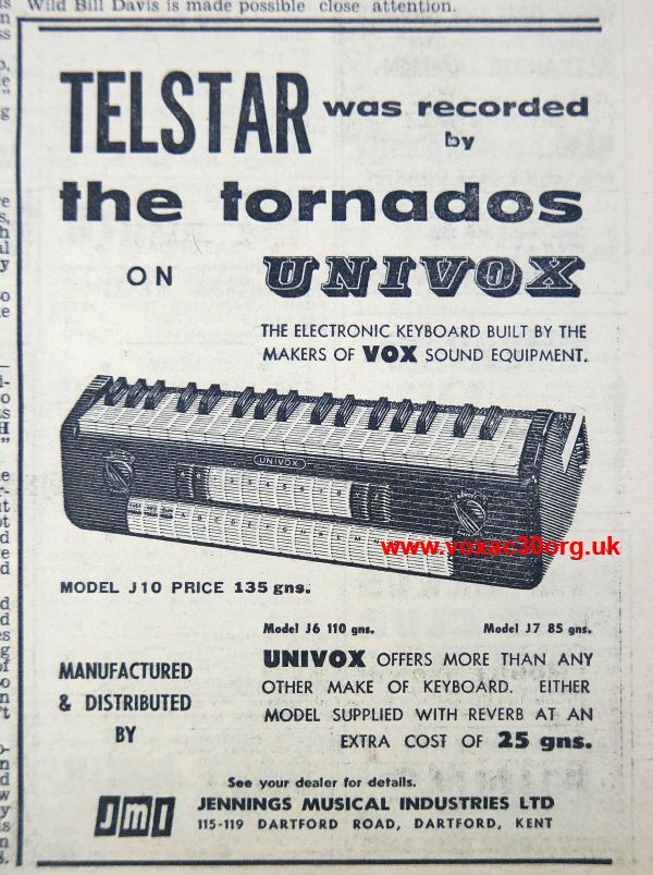 The advert below is something of a puzzle. On the one hand, Roger La Verne and Clem Cattini when interviewed in 2008 made it clear beyond doubt that a Clavioline had been used on the recording of "Telstar". On the other, a number of publicity shots taken at Joe Meek's studio at some point shortly after the track's release (Joe Meek appearing in two of the six currently known) show the group with a Univox, its distinctive chrome keyboard stand plain for all to see. A simple misunderstanding / wrong assumption on the part of Jennings? Jumping on the bandwagon? Selmer so far as one can tell did not put out any adverts relating to "Telstar".