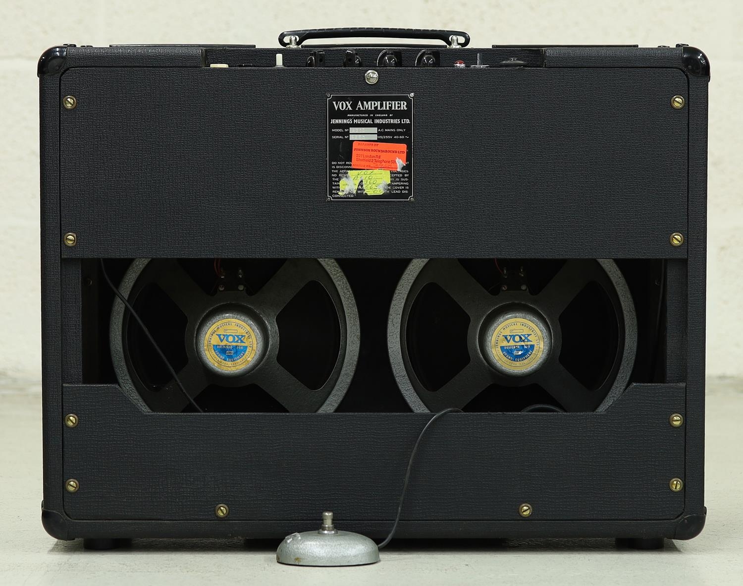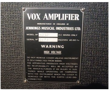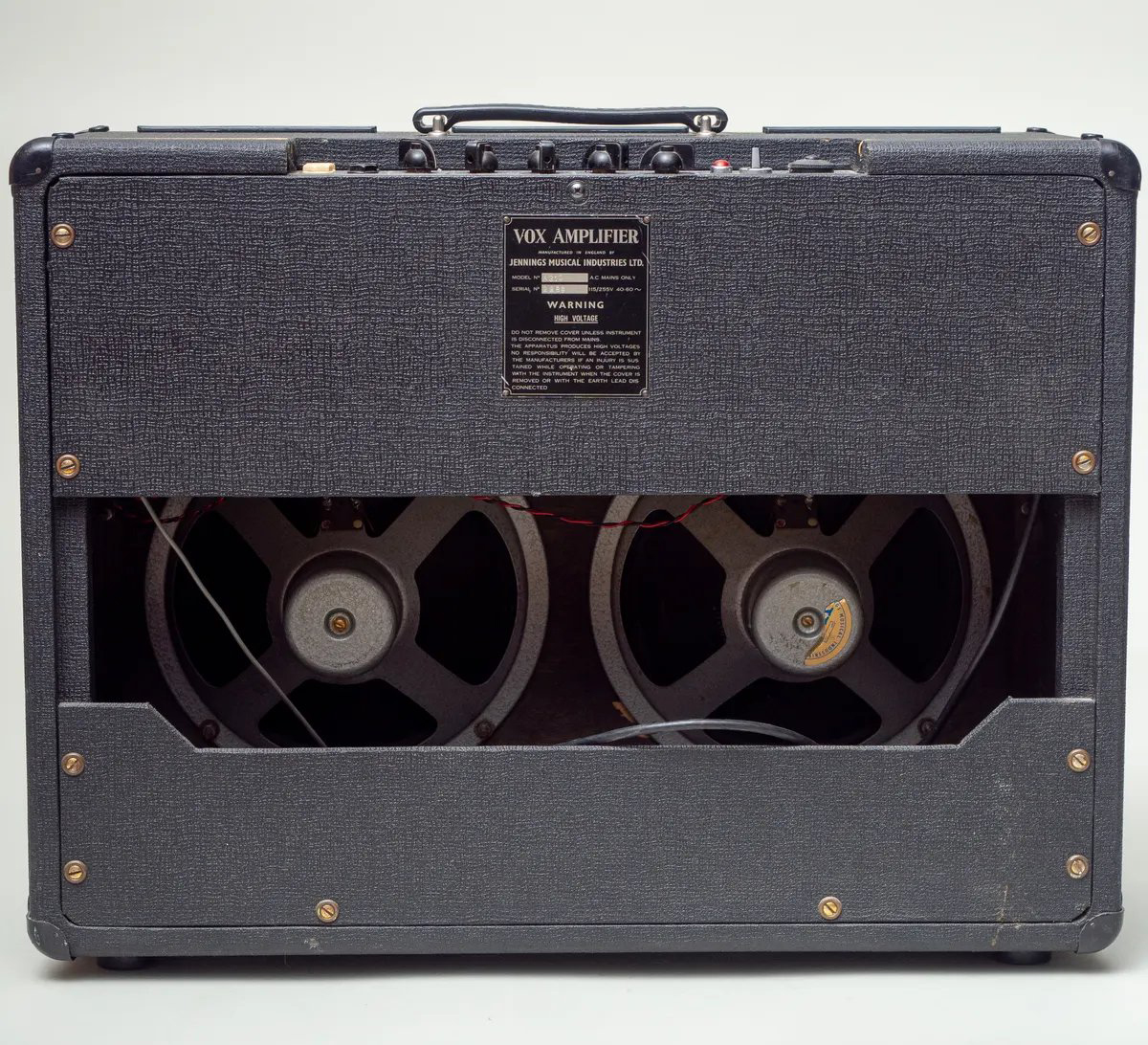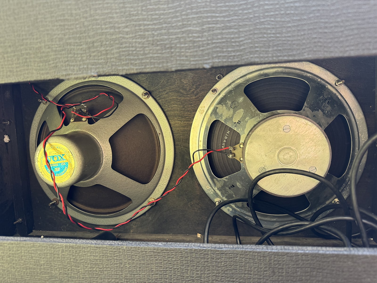 Copper panel - probably a repro. The original dome voltage selector is in place. No details of the electronics. The speakers are now Celestion 7721s with VOX labels, date code "WEL": "W" = 1965.