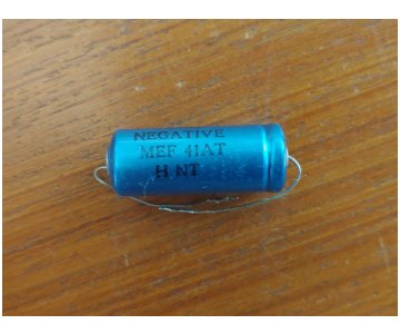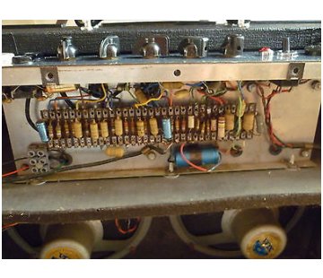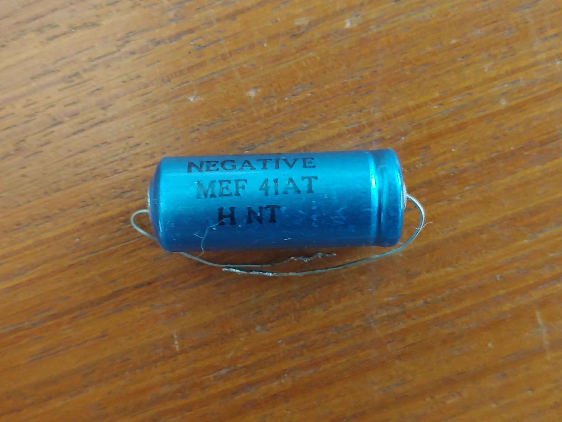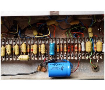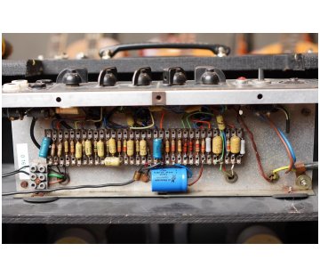 In good general condition all round, speaker and footswitch jacks added to the slider board. Chassis assembled by Westrex, red-print WIMA signal caps in the preamp. The blue Hunts cap pictured has the date code "HNT" = 27th week of 1964 for its manufacture. Thanks to Glen for the pictures.