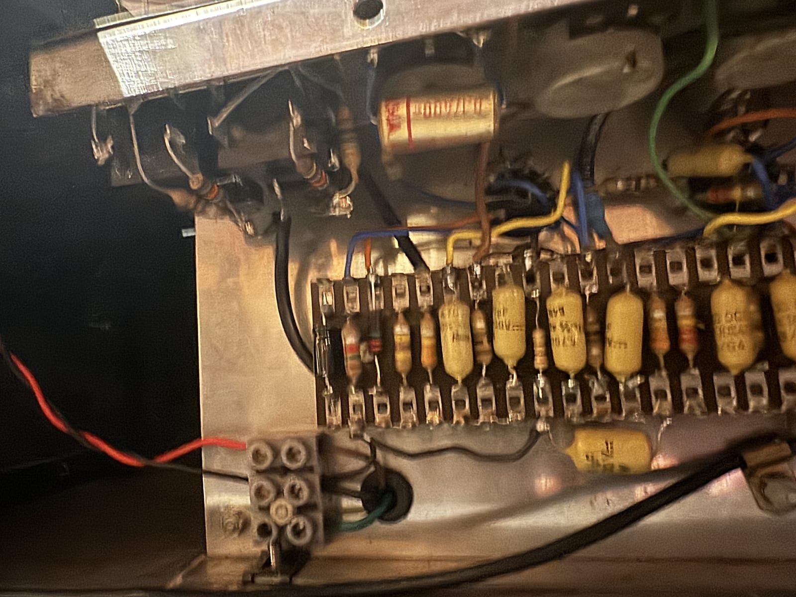 In the preamp, visible Mullard mustard capacitors have the date code "D4N" = last quarter of 1964. One of the Hunts electrolytics has "HUT" = 26th week of '64.
