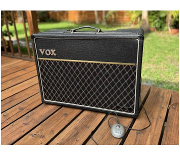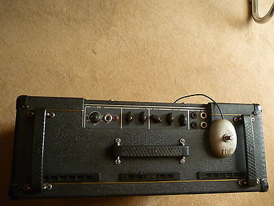 Chassis assembled by Burndept, number 2447. Parmeko transformers. In the preamp, the Mullard mustards have "B4N" and "D4N" date codes = second and last quarters of 1964. The blue Hunts cathode bypass caps have "HUT" = 26th week of '64. The original cover survives. The silver Elacs were evidently given new wiring at some point. The footswitch is from a later 1970s Vox AC30. Thanks to John for the pictures.