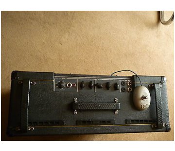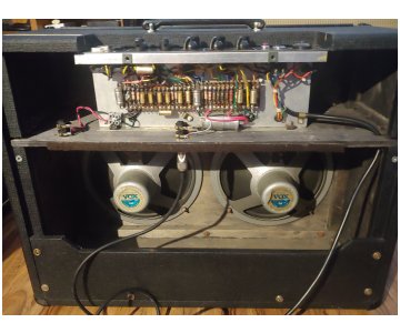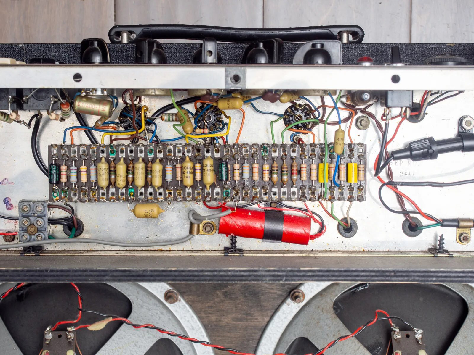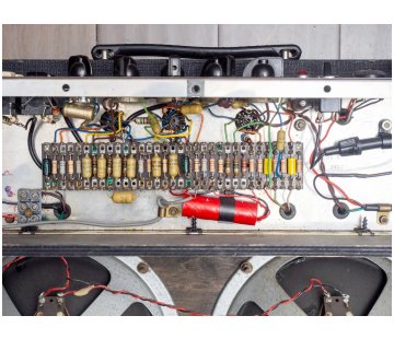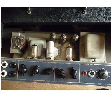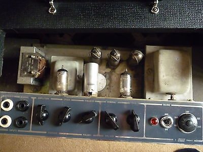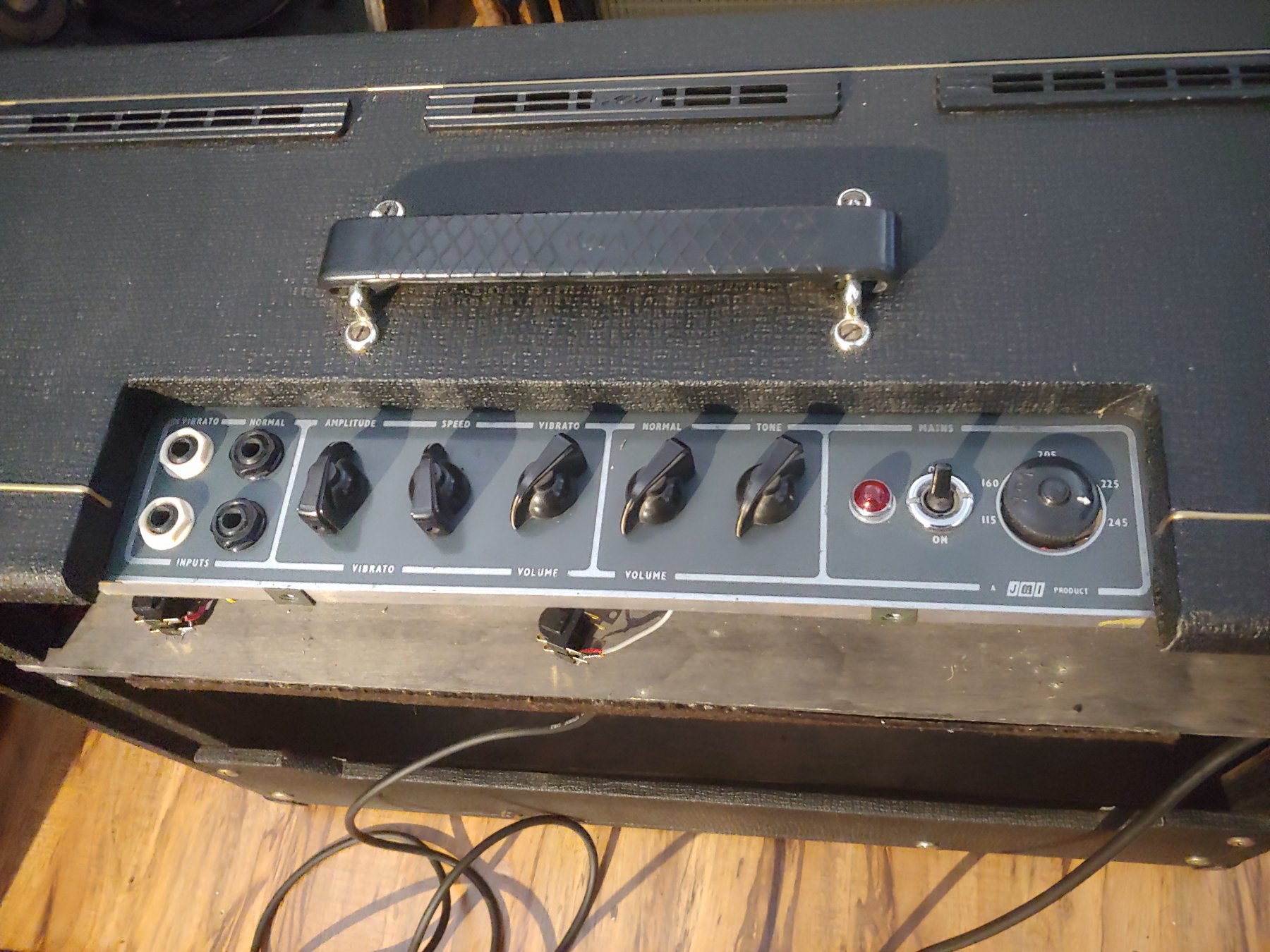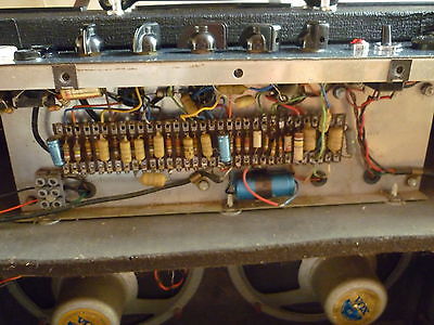 Chassis number 01563. Mullard mustards with "C3W", "B4N", and "B/64" = third quarter of 1963 and second quarter of '64. Blue Elac speakers (of the old type) are now in the speaker compartment. A Top Boost unit was added at some point to the back panel.
