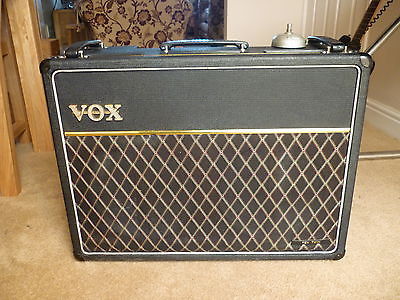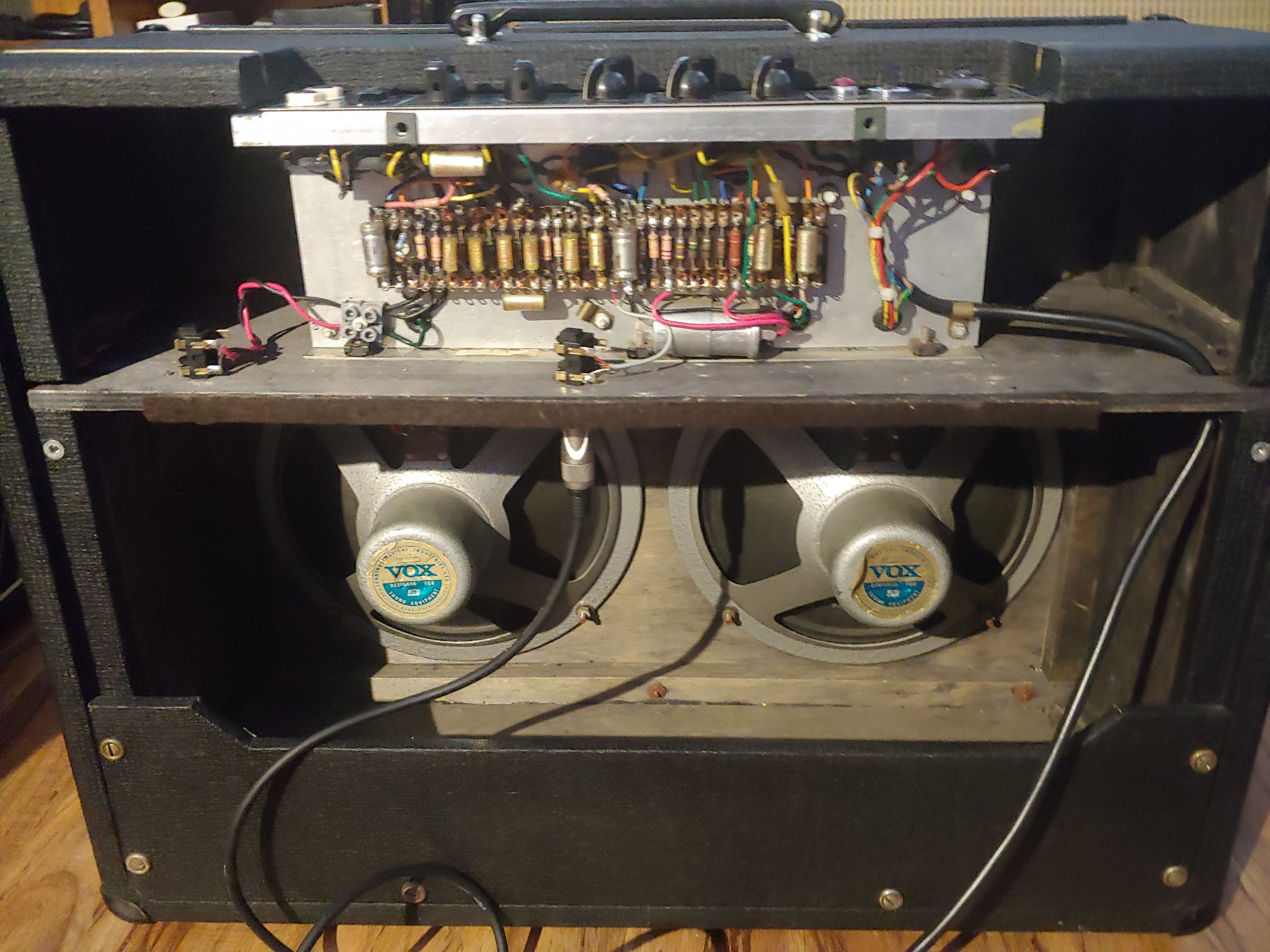 Chassis number 2207(?). Fairly extensively overhauled - no original components with date codes visible. Original Parmeko transformers still in place. The main carrying handle has an empty panel (no "VOX"). Pictured with the amp, blue Elac 10N/81s from some other source.