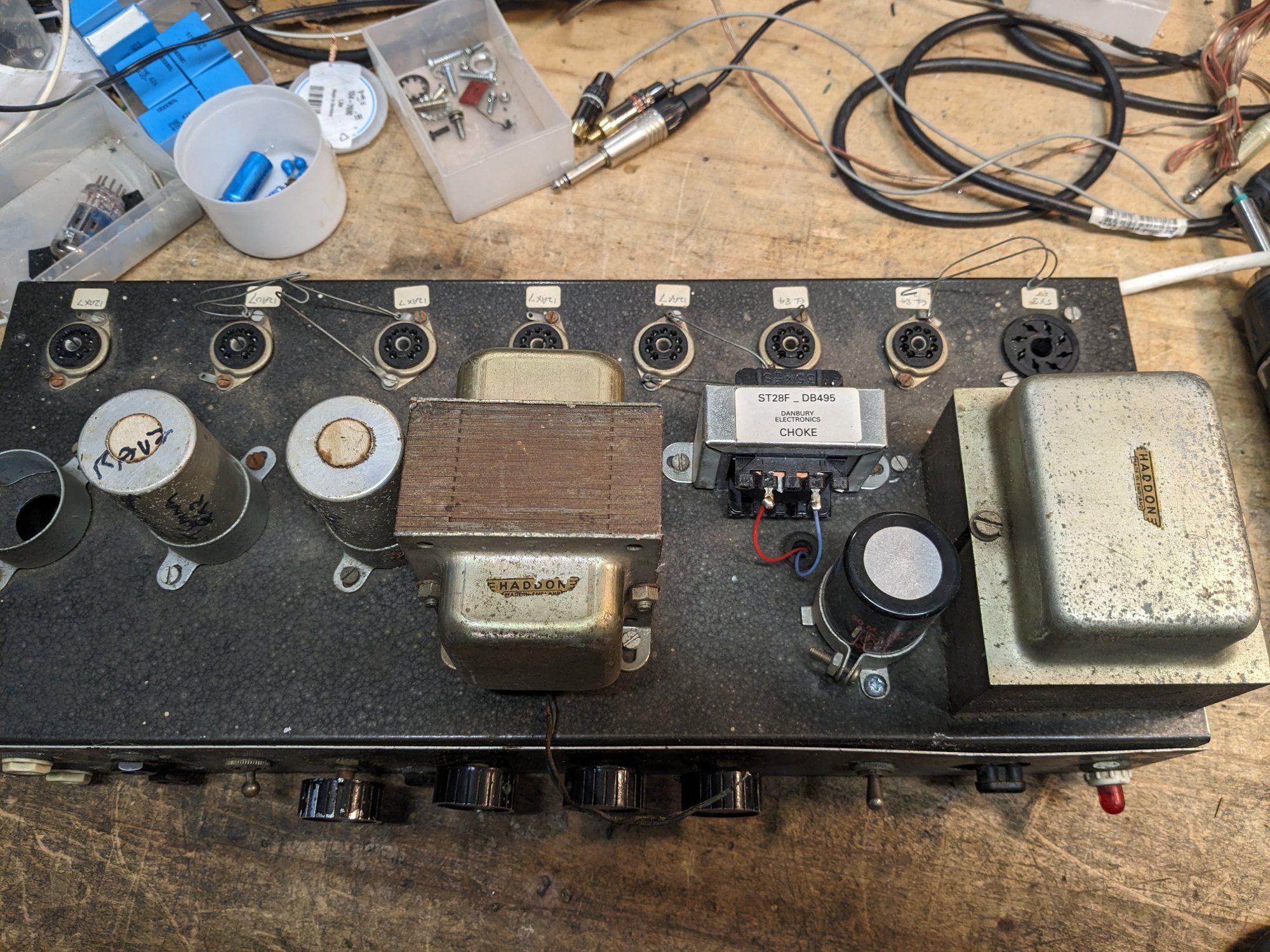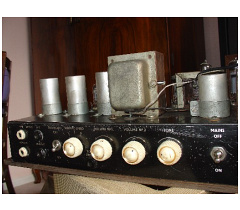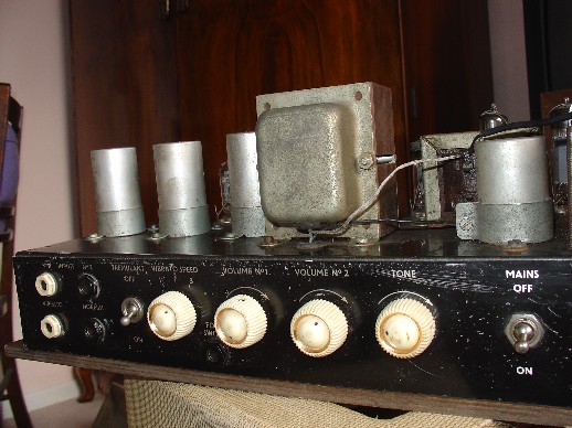Haddon transformers. The rectifier valve is a 5R4. The original cover survives. In the cabinet, a Goodmans speaker. Black carrying handle. Picture number 4 is from the sale of the amp on ebay some while ago.