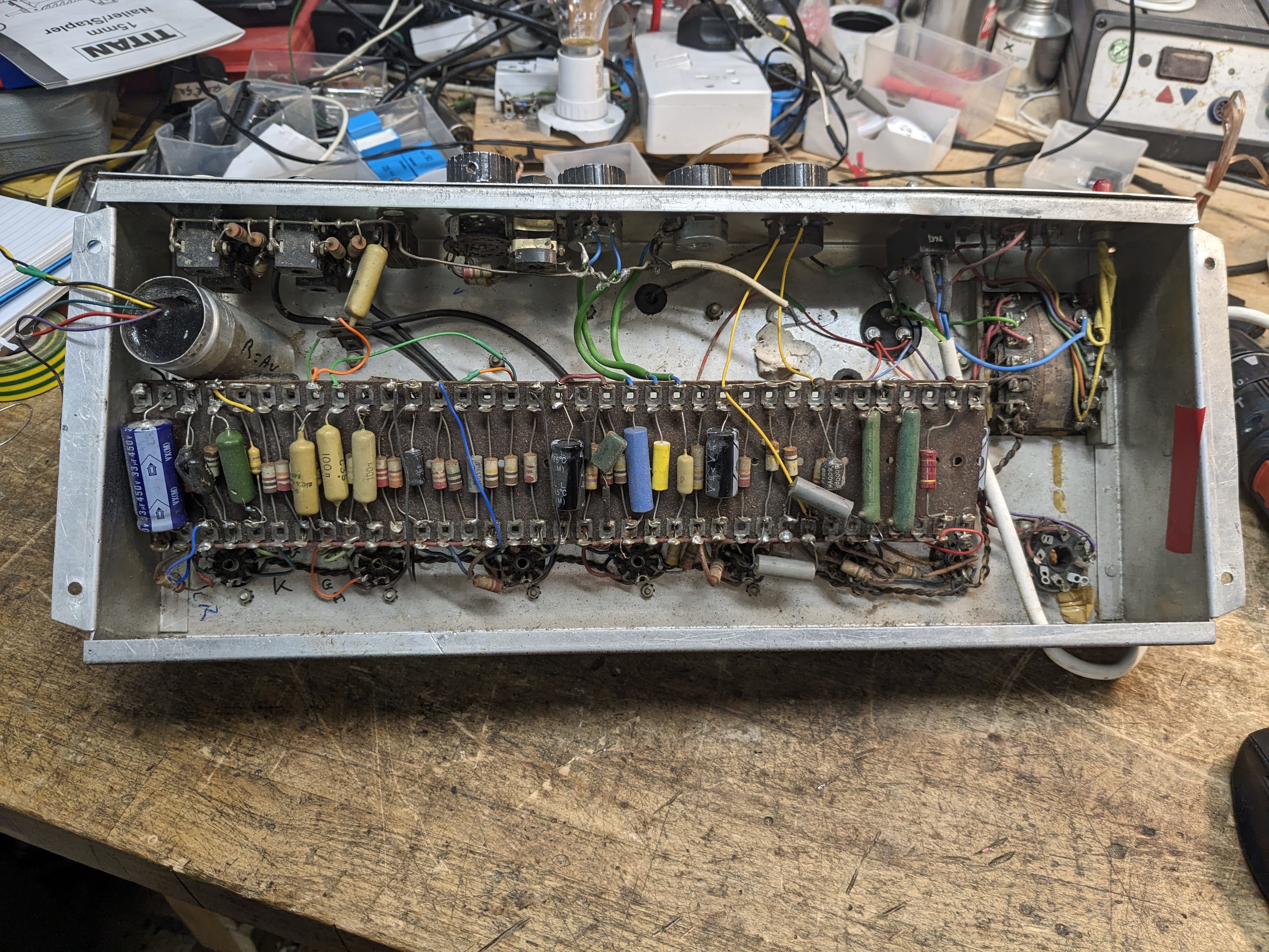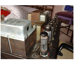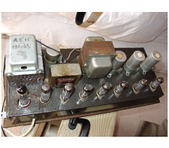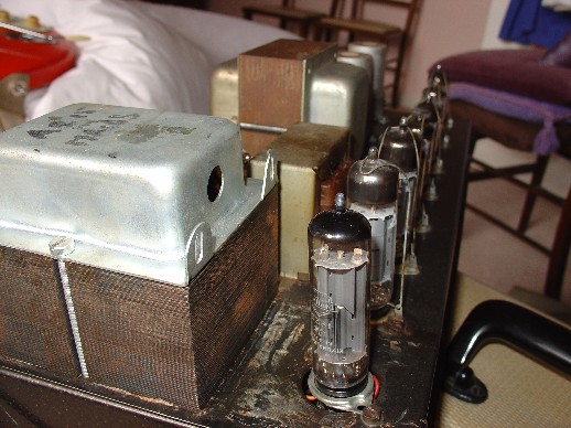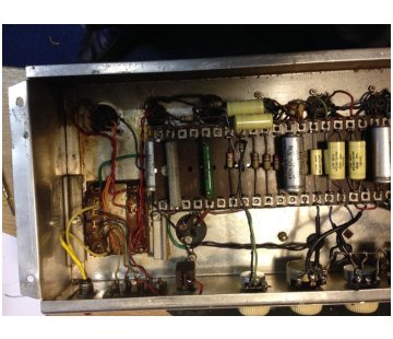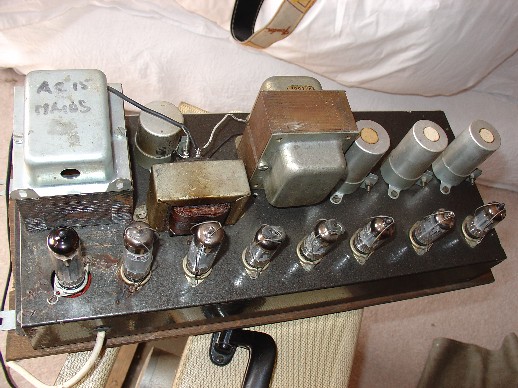 Picture from Jim Elyea's superb book, p. 208. Blue hammertone (hammerite) chassis. The output transformer in the centre of the chassis is a replacement, the original having gone.