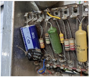 A detail of the chassis of serial number 3708 showing the anti-vibration sockets for the Vibrato Channel valves and the cans behind hiding some of the circuitry.