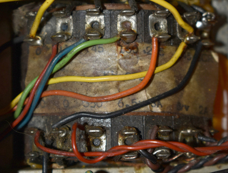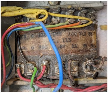 The transformer's part number appears to have been "KH" followed by three numbers (obsured by wires in the photo). The voltage selector was printed accordingly. Pairs of voltages are specified, one tap or other in the transformer falling between the two. The pairs are 110/120v; 135/155v; 156/170v; 200/225v (?); and 225/245v.