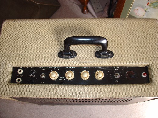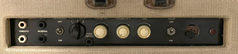 Superb cosmetic condition. The output transformer has been removed; the original anti-vibration preamp valve sockets may have been replaced, though that is not certain. In the preamp, Hunts capacitors with "YAD" and "WID" date codes = 9th and 13th weeks of 1958. One of the green TCC caps has "PH" = August 1958. The black WIMA Tropydur caps have date codes for 1956 and 1958. The speaker is a Goodmans Audiom 60. Black carrying handle. The control knob for the vibrato speed is of the type used on certain Jennings Univox J6 keyboards.