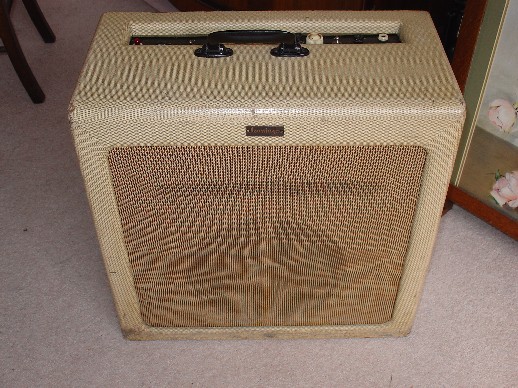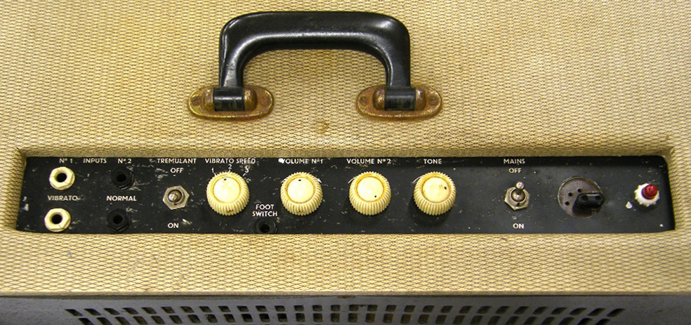 In general form, the cabinet, with its TV Front, emulated Fender amplifiers of the period, the early Fender Pro being closest perhaps in overall proportions. The AC1/15's cut-out for the control panel was probably copied from Selmer however - no Fender amplifier ever had one. Later it was done away with. More on that to come on the page dealing with second circuit amplifiers (early 1960).