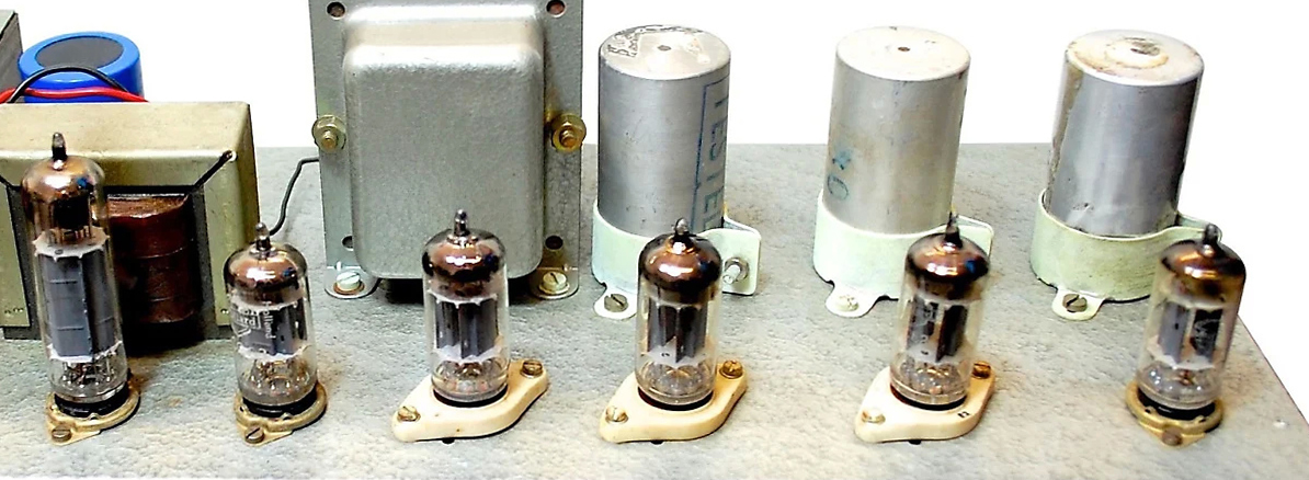 In the preamp of the Normal channel, the main driver valve (V1) is an ECC83; for the Vibrato (Vibravox) Channel, two ECC83s and an ECC82 (as a modulator). Early in production, anti-vibration sockets mounted on thick white rubber bases were provided in the preamp for the Vibravox valves. The phase inverter - the valve that drives the push-pull of the EL84s - is an ECC83, configured as a "long-tail pair", the signal being driven through the plates (anodes) of the two triodes contained in the valve envelope.