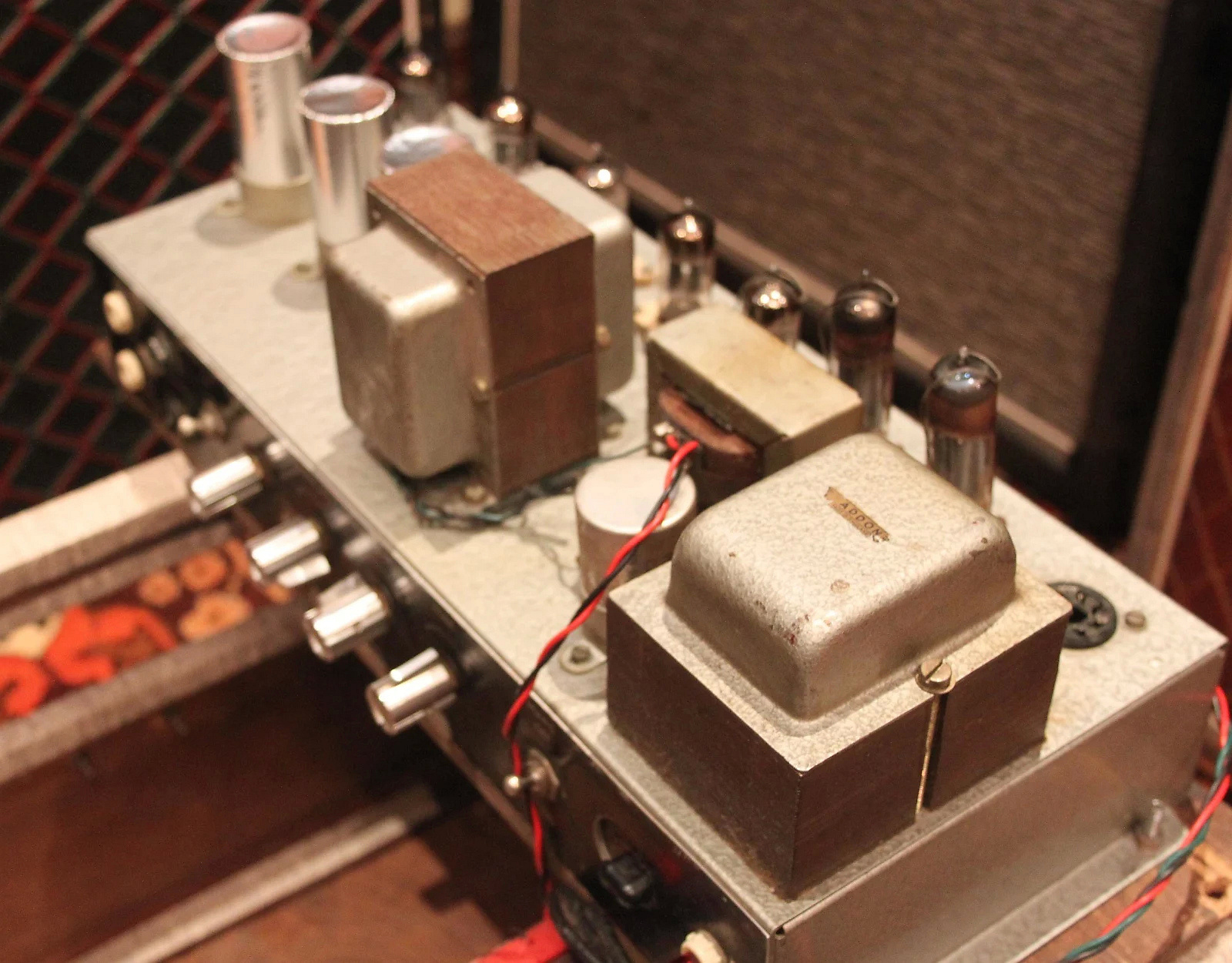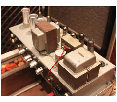 Output transformer without shrouds / end bells, as the amp immediately below. The arrangement of the Vibravox cans indicates that the amp could be linked up with Vox Piano Vibrato control unit - see this page.