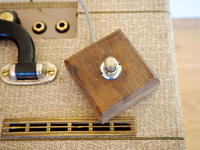 Below, a shot of an early JMI wood-block footswitch, in this instance issued with an AC2, but identical in form to the ones provided with AC1/15s to switch the vibrato in and out.