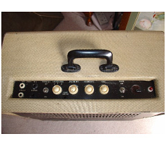 A detail from a Vox flyer for the AC1/15, early to mid 1959 - one can just see the three white control knobs for volume and tone, and the larger black one for the vibrato speed. White carrying handle.