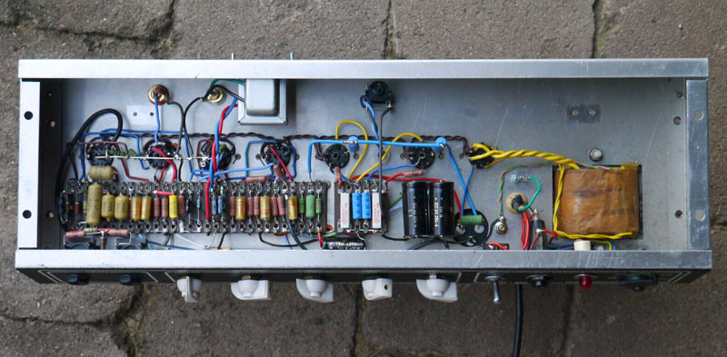 The insides of these amps are not often illustrated. In the amp below, a later reverb pan has been used - of the type fitted to the Vox solid state amps of late 1966 / early 1967. The cut-out for the chassis on the slider board is professionally done.