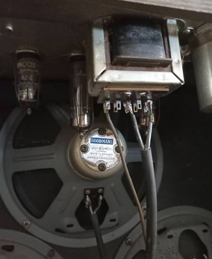 A "Mystery Amp" with a relatively tidy set of Goodmans 10" drivers with plain bells (magnet covers). At least three further amps have 10" Goodmans, but with red "tin can" style covers. All three are extremely scrappily wired.