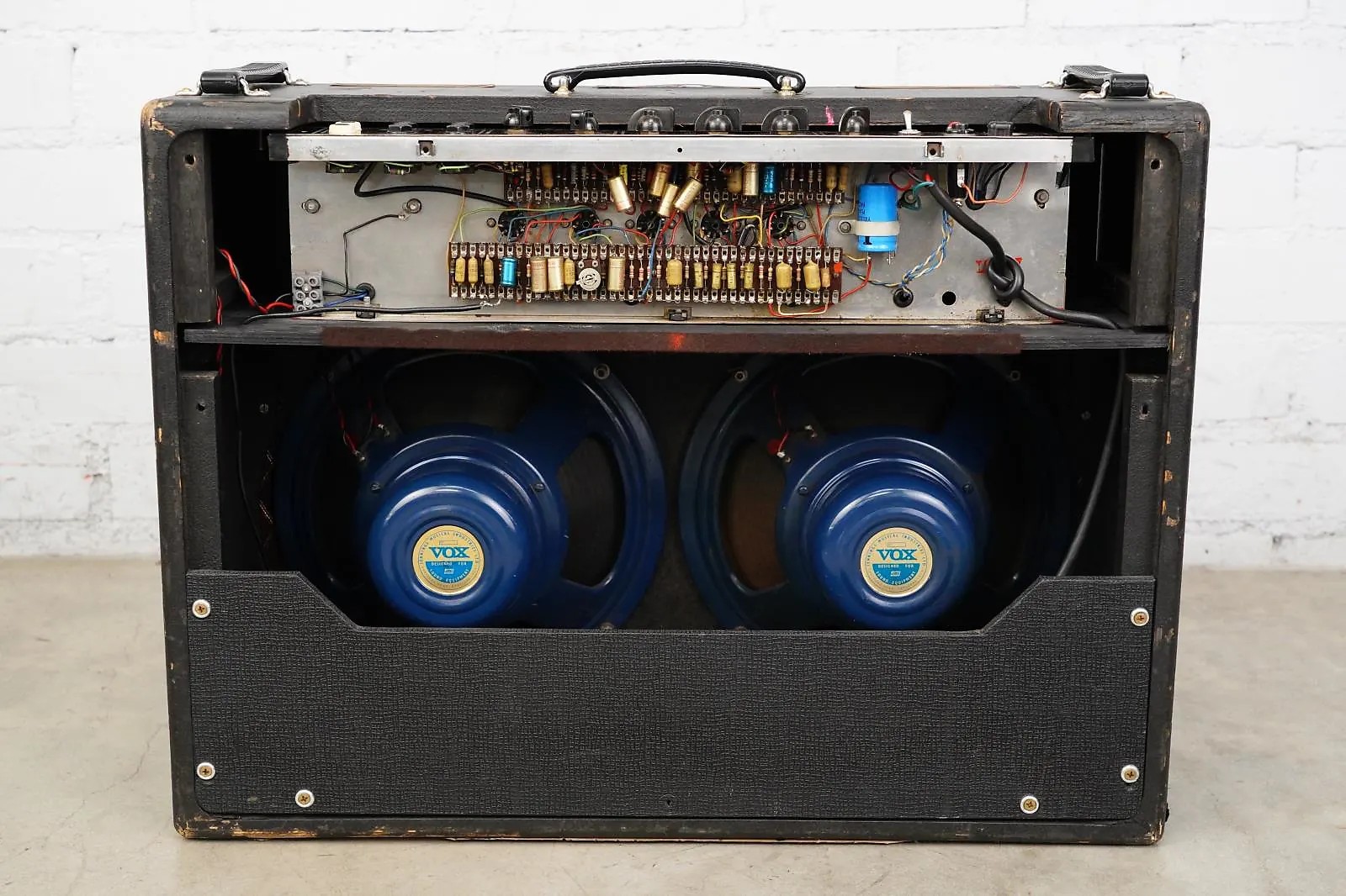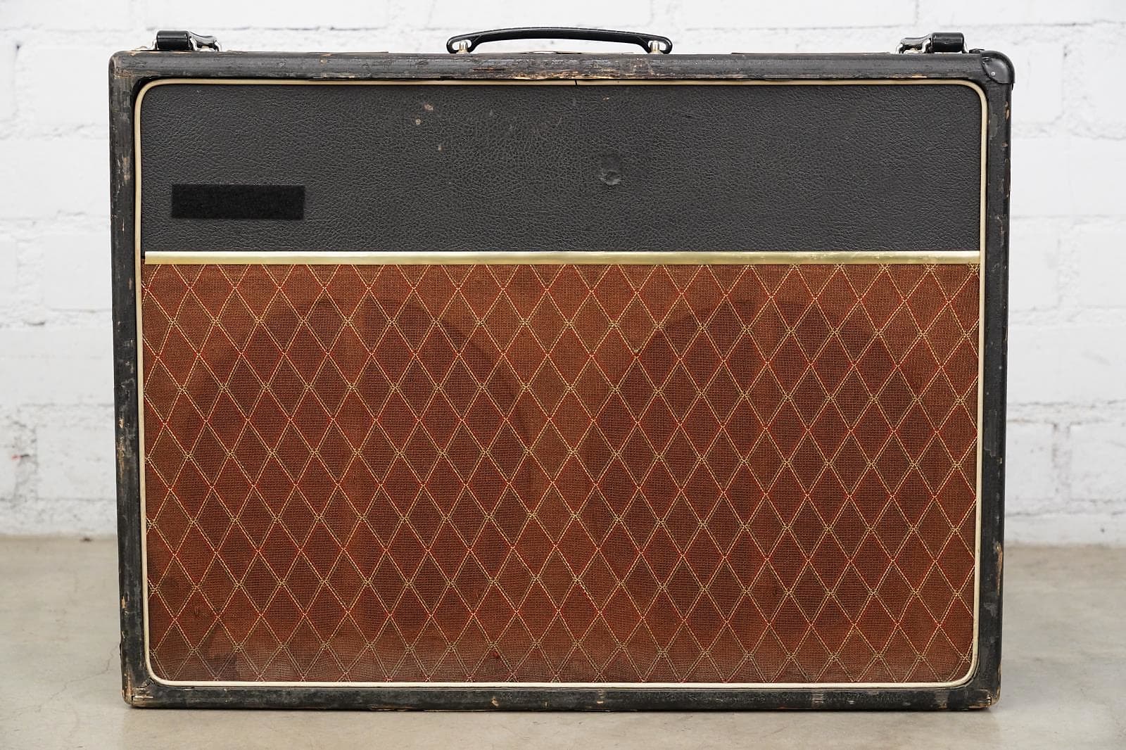 Pebble charcoal covering. Top boost in panel. Chassis assembled by Westrex; Albion transformers. The main preamp filter capacitor has the date code "UG" = August 1963. The original Celestion speakers (with "Heavy Duty" labels) are still in place.