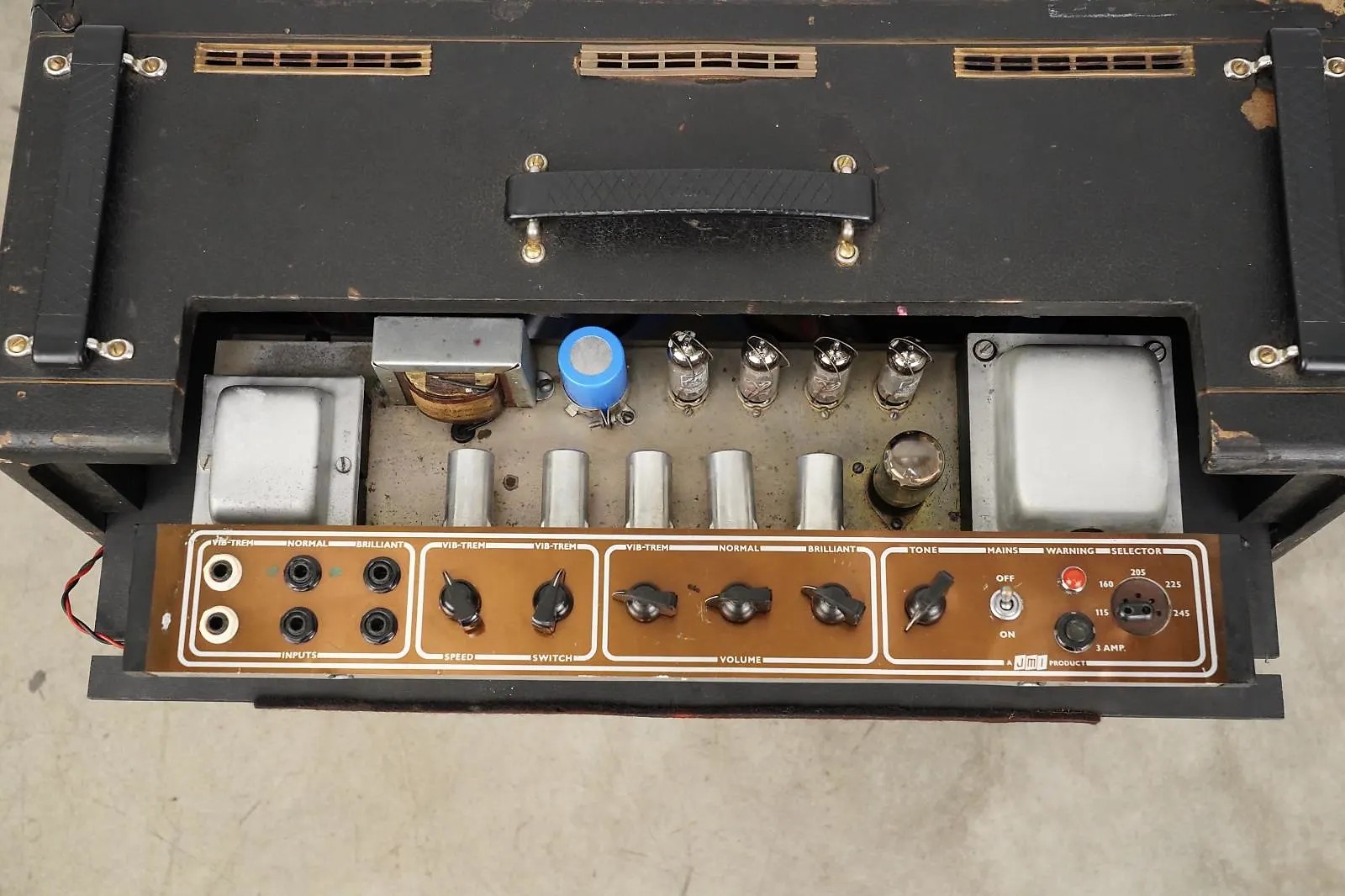 Chassis number in the 3000s. Assembled by Burndept for JMI. Woden transformers with date codes: - mains "MU" = December 1963; output and choke "AV" - January 1964. The serial number plate gives the amp's voicing as "Normal" but the chassis is stamped "Treble". In the speaker compartment of the (well worn) cabinet, one Celestion blue and one silver. Pebble pattern vinyl covering.