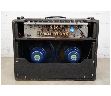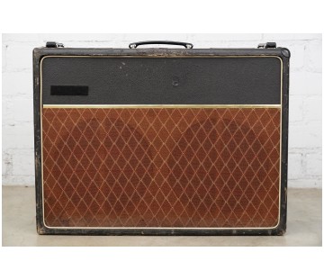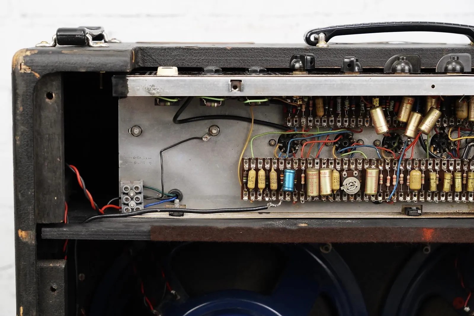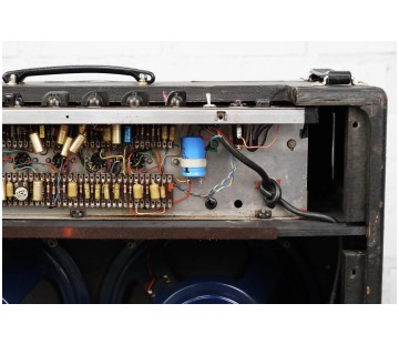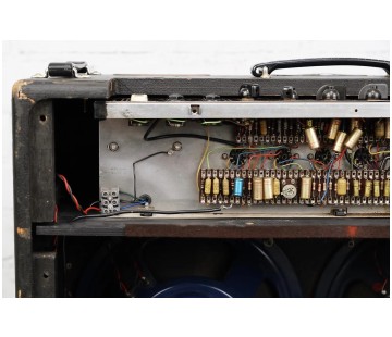 Chassis assembled by Westrex, top boost controls in panel, now in a cut-down Twin cabinet. Signed under chassis in pencil "DP" with an "X" (to indicate "expanded") in a circle. Transformers made by Albion. In the preamp, the gold-coloured TCC 25uf bypass capacitors (all three) have the date code "UF" - June 1963. The Vib-Trem volume pot may have a date code ending "L", which would be 1964, but the detail is too indistinct to be wholly certain. The original cement 50R cathode bias is still present in the power section. Sold by The Music Locker in 2022.