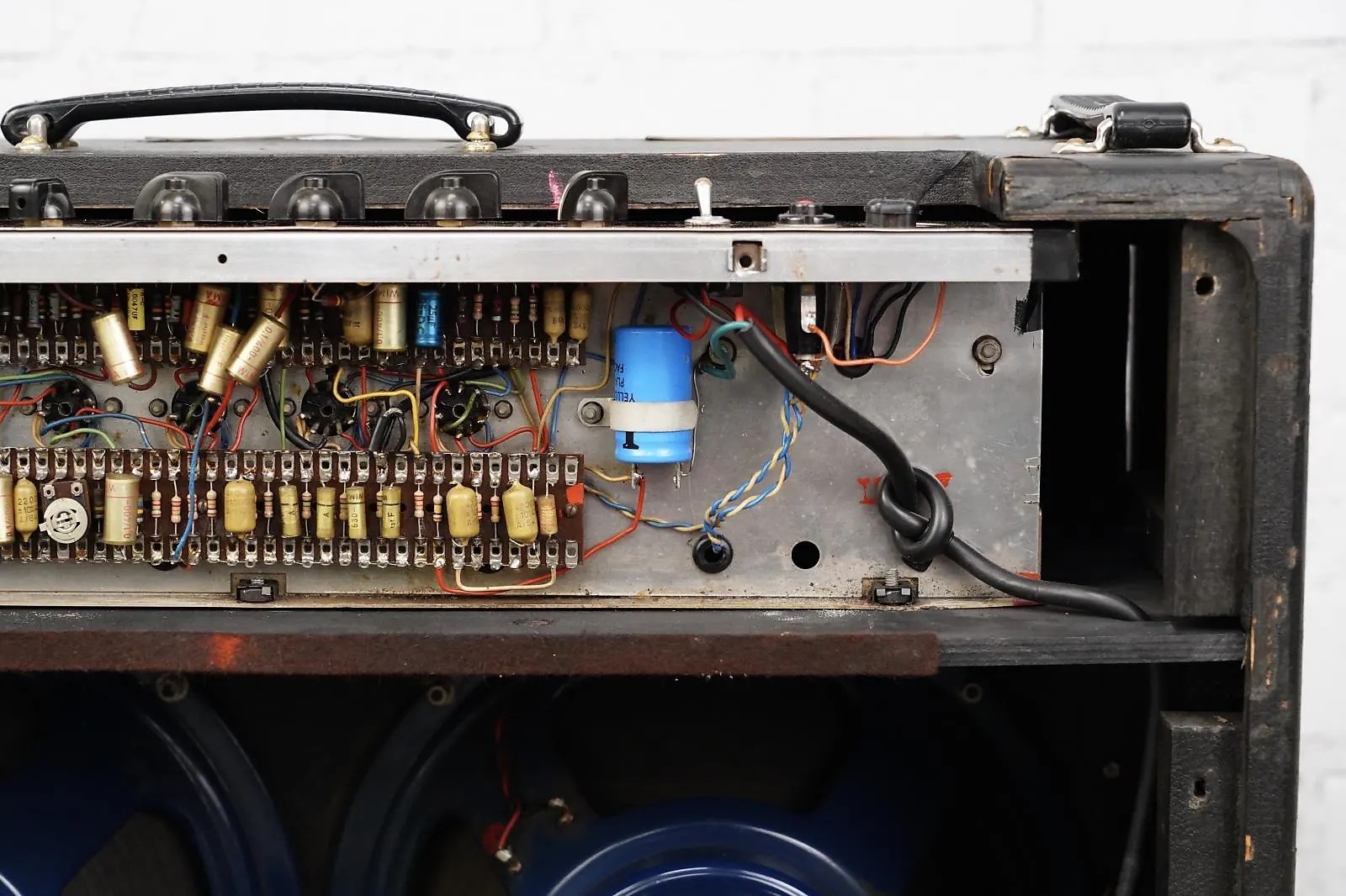 A Super Twin amplifier section. Chassis assembled by Westrex; Albion transformers; copper control panel with integrated Top Boost controls. The cathode bias resistor and main electrolytic capacitors have the date code "UG" = July 1963 for their manufacture. The original yellow-print Mullard preamp valves have the paint code "LA" = January 1964.