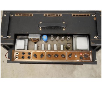 Chassis with top boost in panel assembled by Westrex; Albion transformers. On the underside, the standard marking "X", indicating "Expanded" or "Extended", initialled by "DP". The serial number plate (751xN) comes from another amp. The cabinet has basketweave vinyl and black vents.