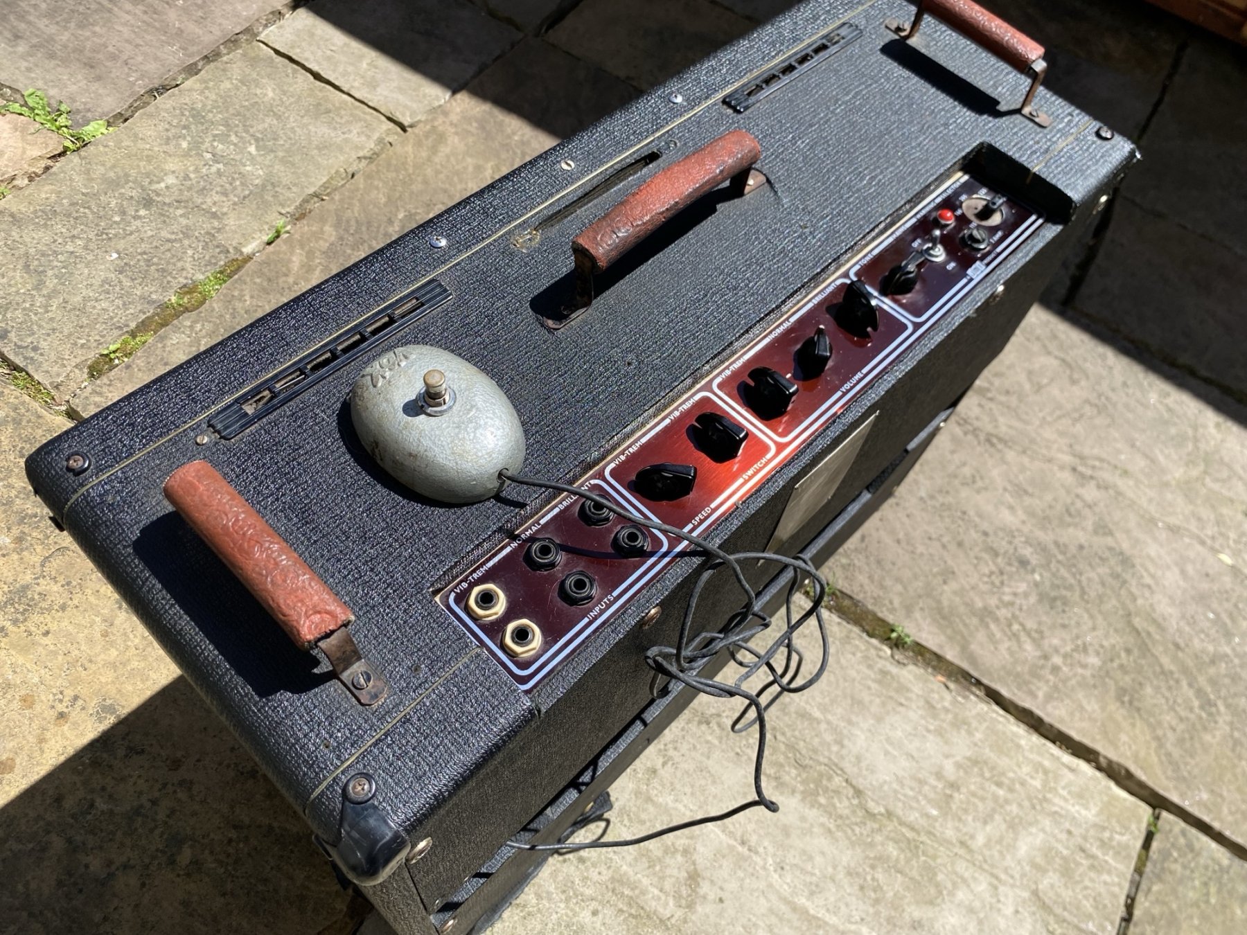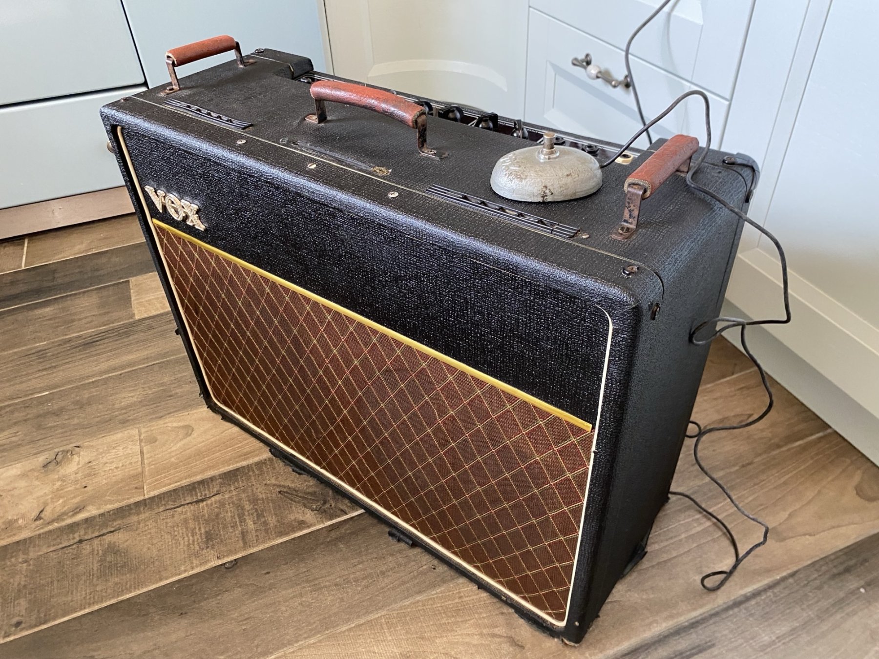 Copper control panel, brown grille cloth. Cabinet covered in basketweave vinyl, black vents on top, the one in the centre with a Vox logo painted white. The amp is pictured with swivel side stands.