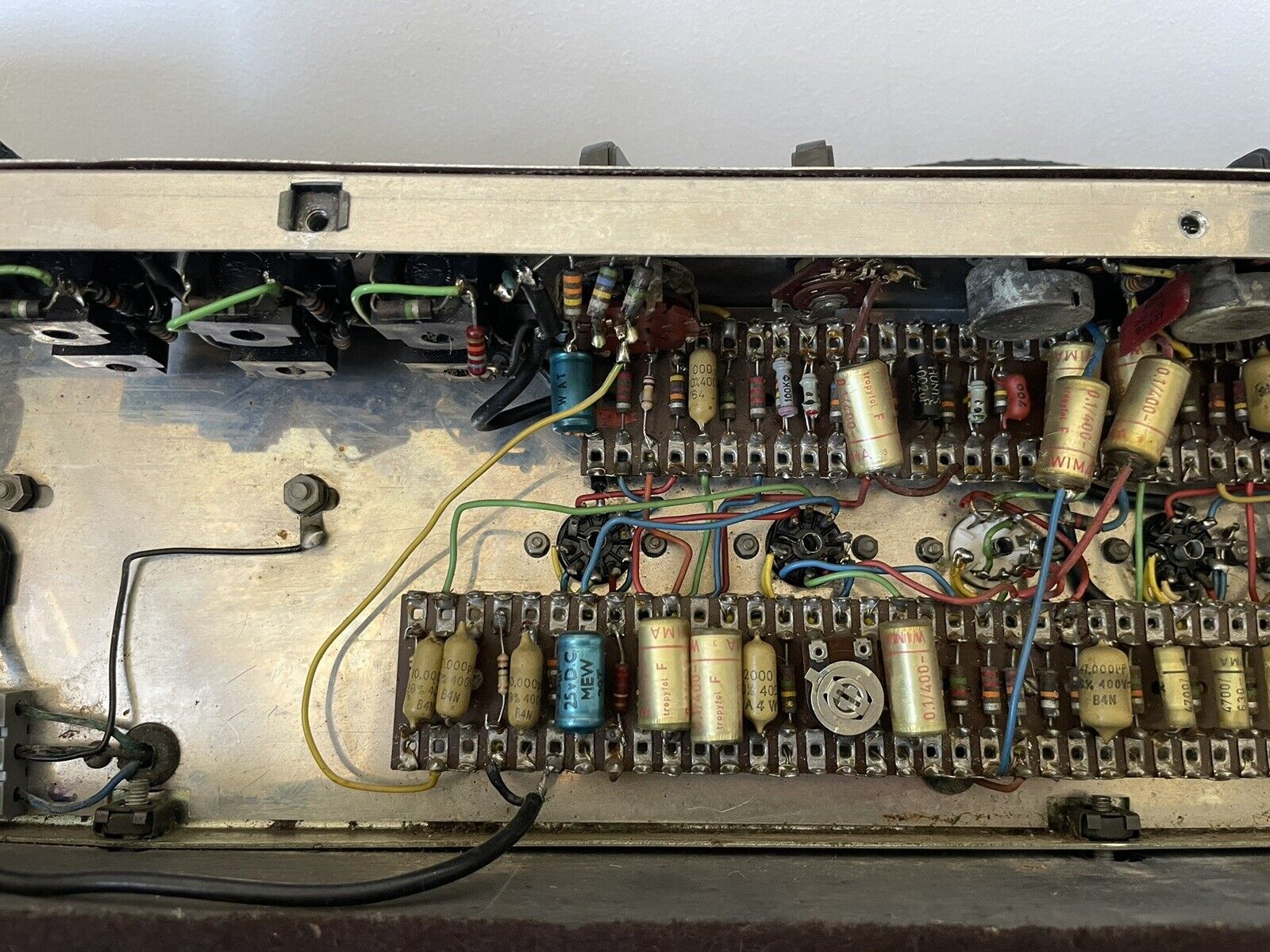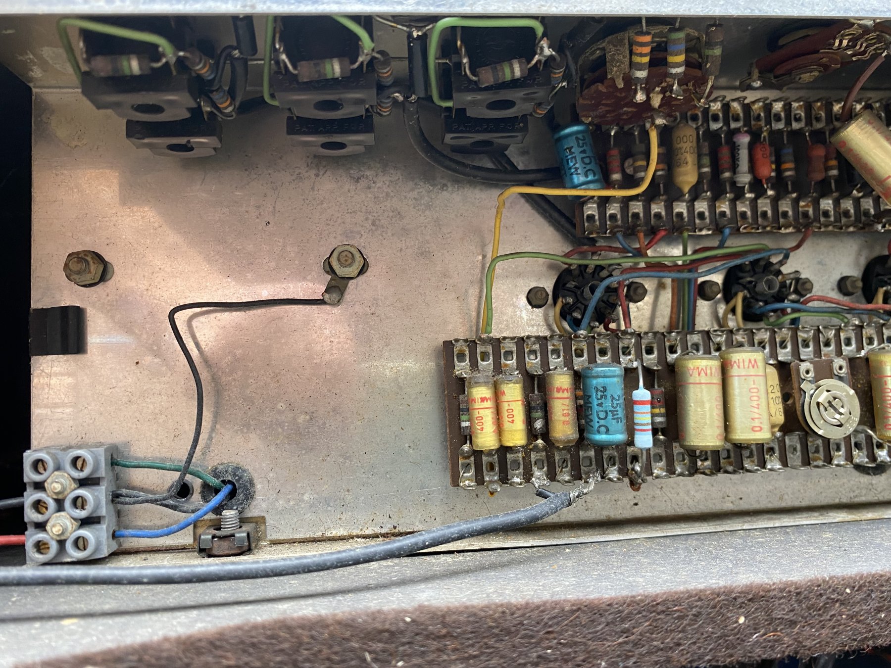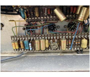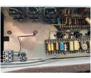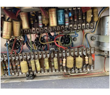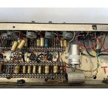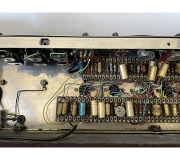 Chassis number 06256. In the preamp, Mullard mustard caps with "B4N" = second quarter of 1964, and at least one Hunts cap. with "WYT" = 10th week of 1964 for its manufacture.