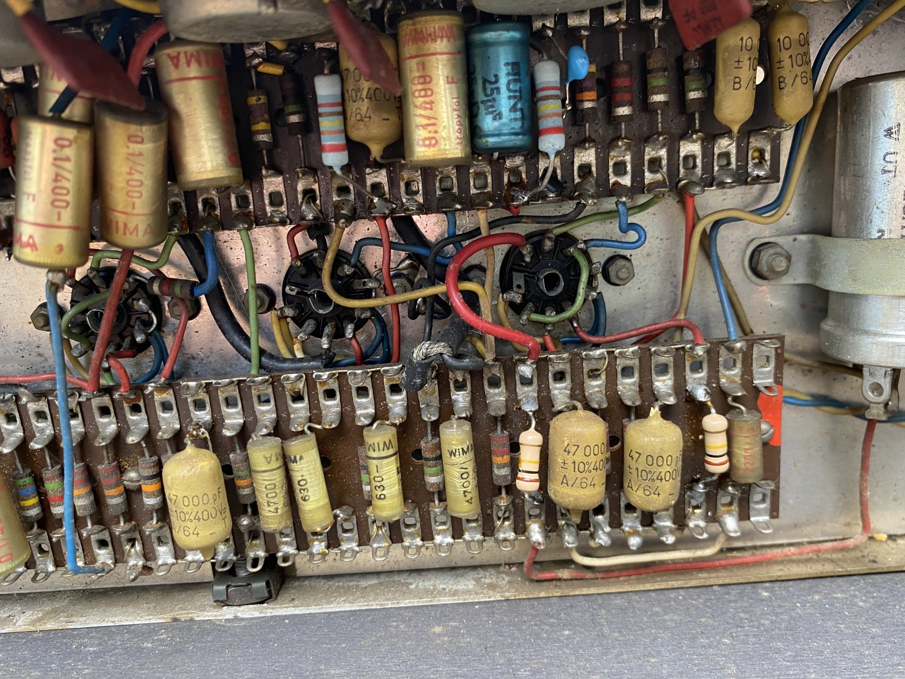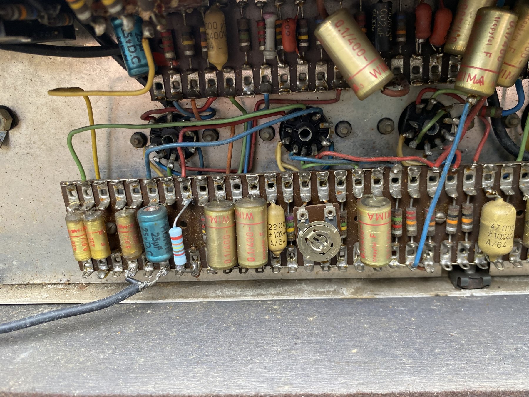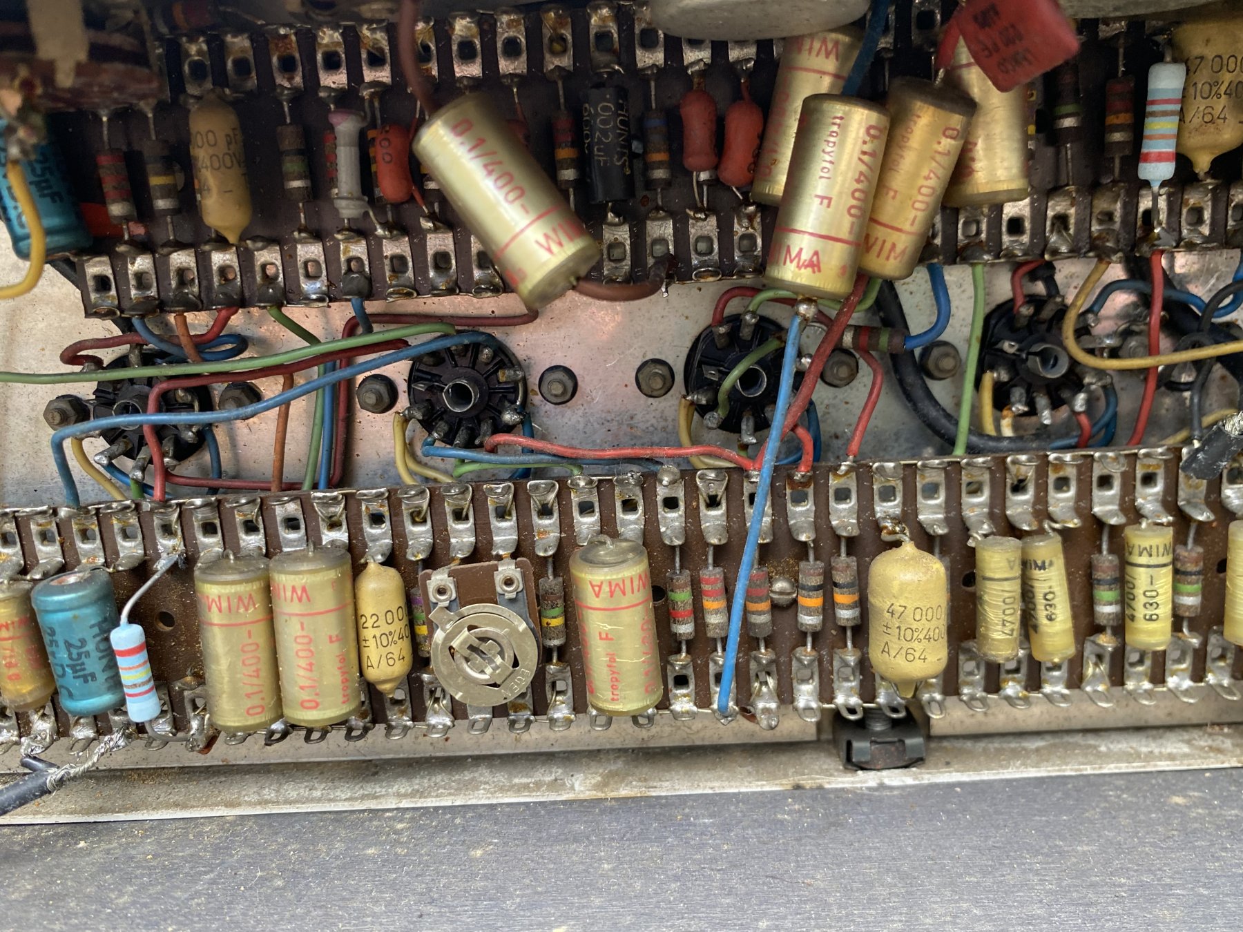 Chassis assembled by Burndept, chassis number 05901. In the preamp, a mixture of WIMA and Mullard mustard capacitors, the latter with B/64 date codes = second quarter of 1964. The main Hunts preamp filter has "WUT" = 1st week of 1964, and the blue Hunts cathode bypass caps have "WIT" = 3rd week of 1964 for their manufacture.